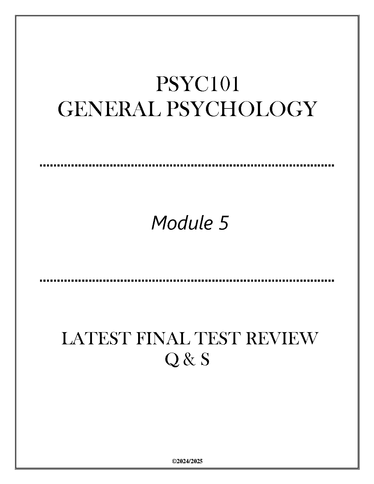 Ace your PSYC101 General Psychology final exam with this comprehensive review guide. This resource includes questions and answers covering all key concepts in Module 5, helping you achieve top marks and avoid resits. Perfect for the 2024-2025 academic year.