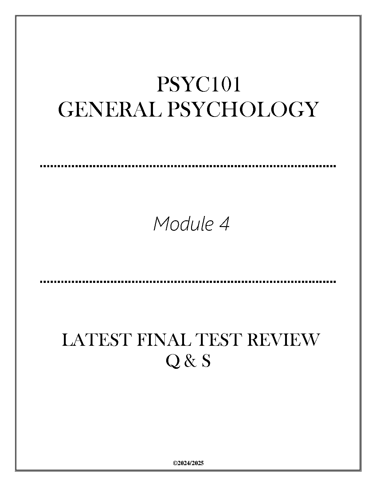 Ace your PSYC101 General Psychology final exam with this comprehensive review guide covering Module 4. These expertly curated questions and answers are designed to help you master the key concepts and pass with confidence. Prepare for success in the 2024-2025 academic year, eliminating the need for resits.