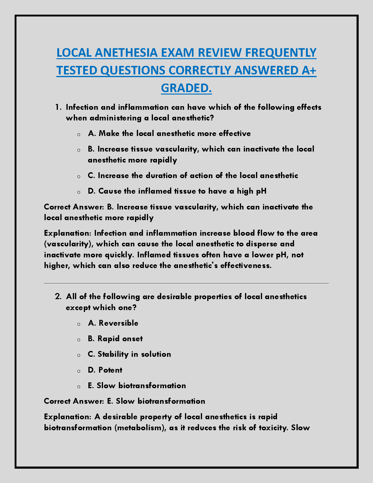 Ace your local anesthesia exam with this comprehensive review guide, designed to help students pass on their first attempt. This guide includes frequently tested questions and detailed explanations to ensure exam success and avoid resits in the 2024-2025 academic year.
