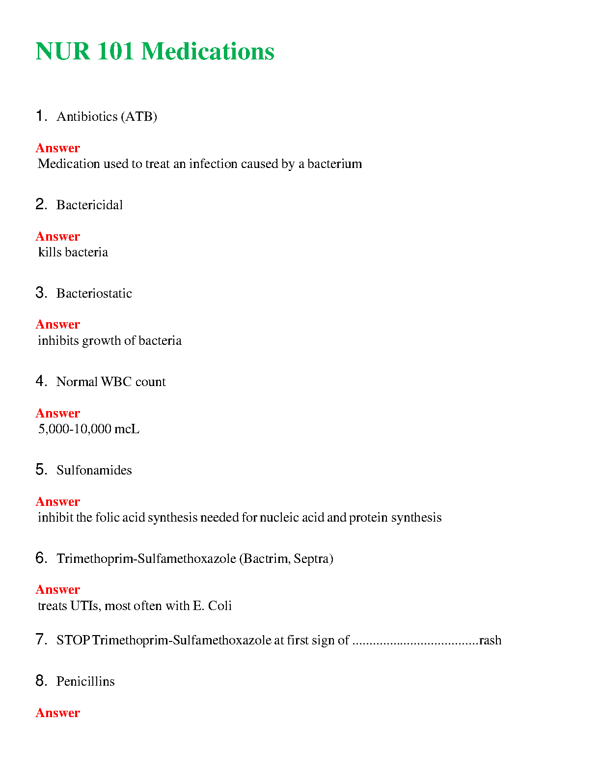 Ace your NUR 101 exams with this concise and easy-to-understand guide covering key medication concepts. Master antibiotics, bactericidal agents, bacteriostatic agents, and more, ensuring first-attempt success and avoiding resits. Ideal for 2024-2025 academic year.