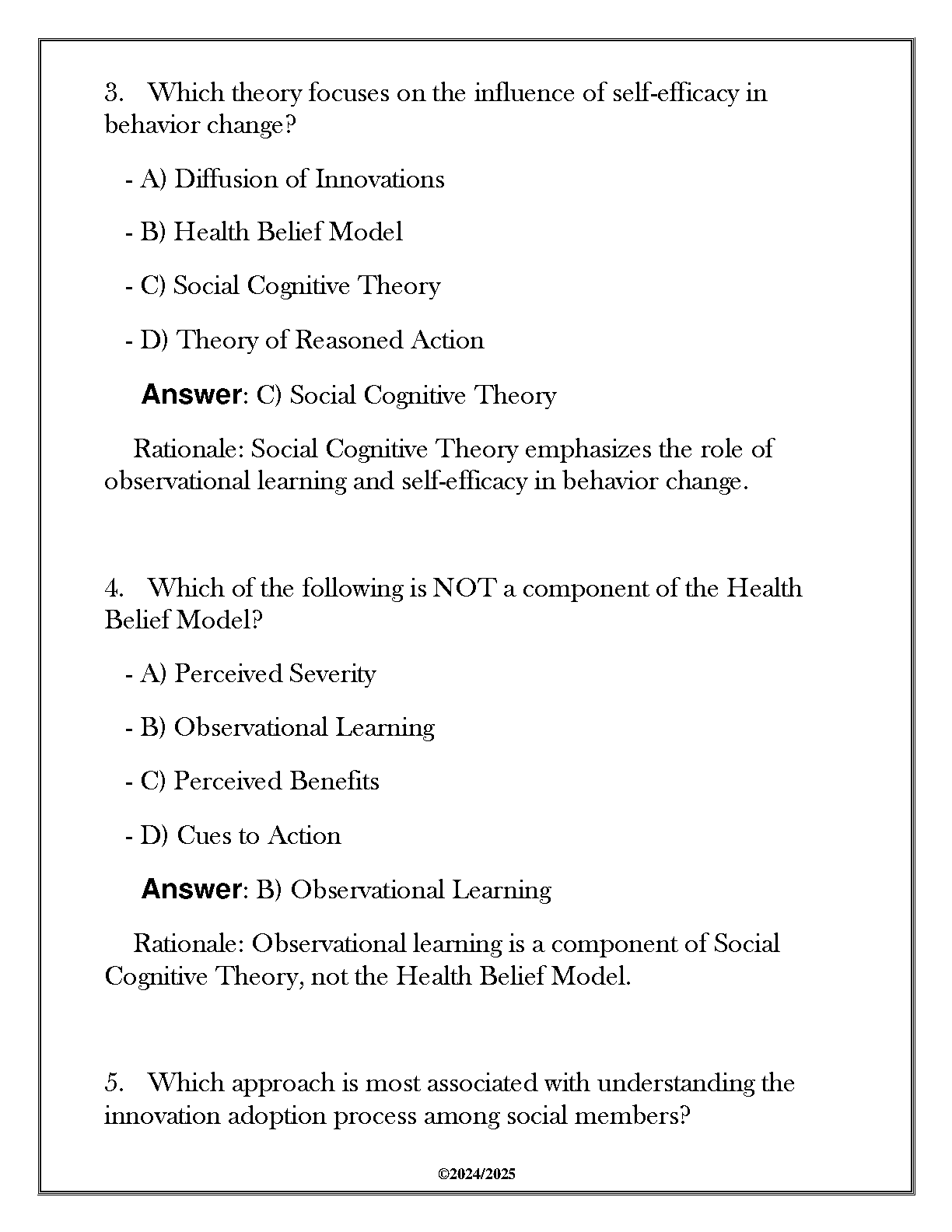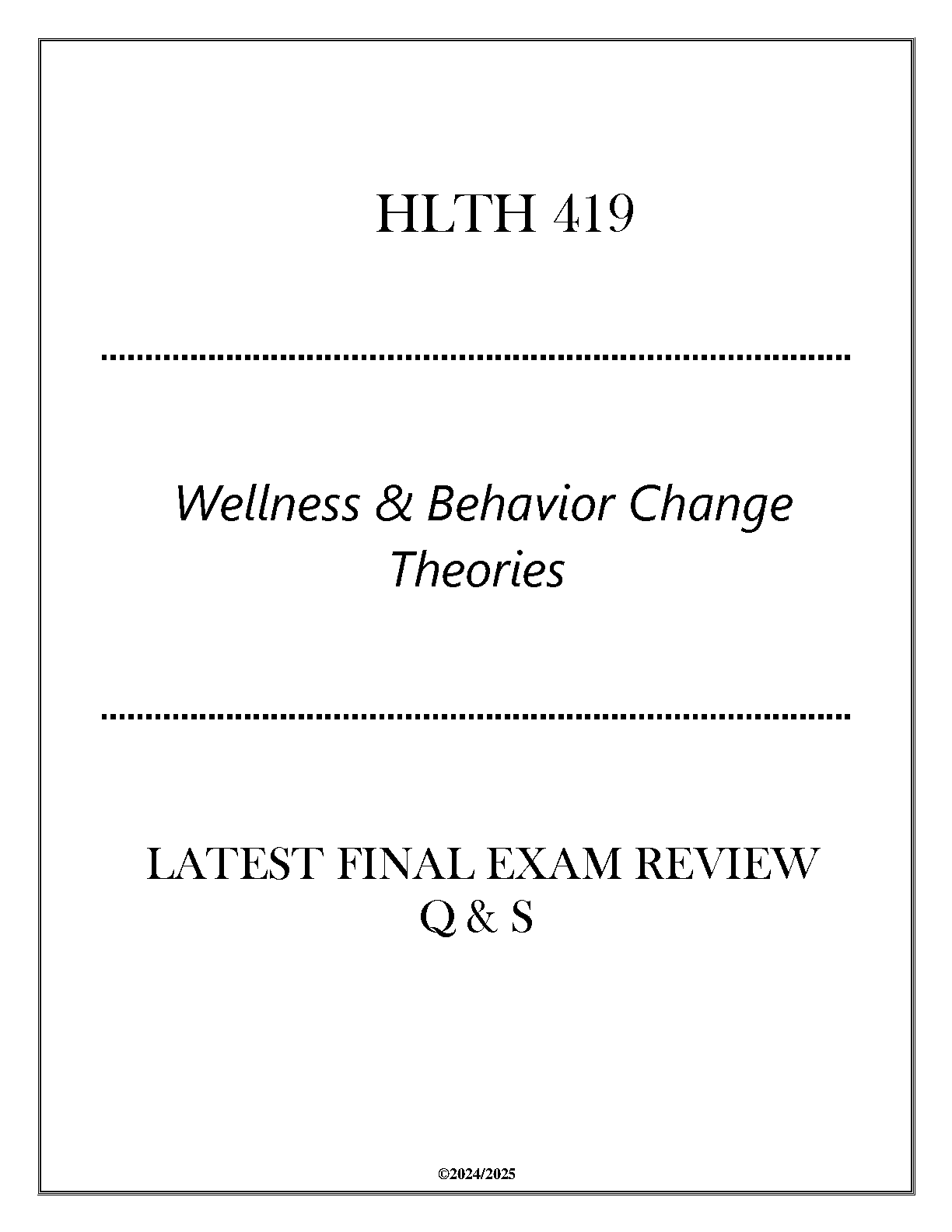 Ace your HLTH 419 final exam with this comprehensive question and answer review guide. Specifically designed for the 2024-2025 academic year, this resource covers key wellness and behavior change theories, ensuring first-attempt exam success and avoiding costly resits.
