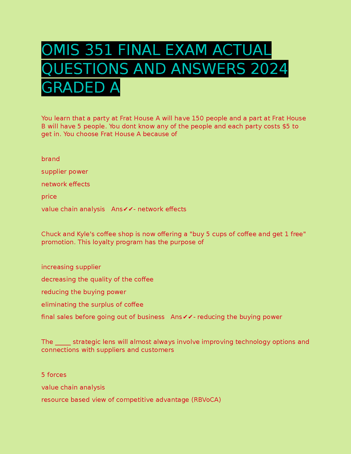 Ace your OMIS 351 final exam with this comprehensive guide featuring actual questions and answers from the 2024 exam. Achieve a perfect score and avoid resits with this valuable resource.