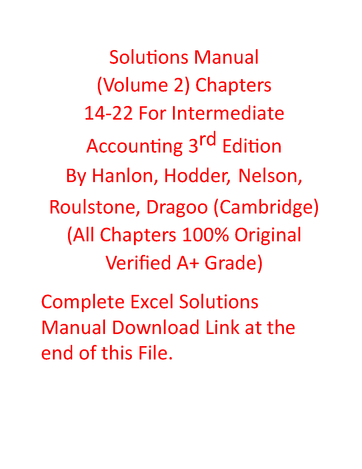 Download the complete solutions manual for Intermediate Accounting, 3rd Edition, Volume 2, Chapters 14-22 by Hanlon, Hodder, Nelson, Roulstone, and Dragoo (Cambridge). This manual contains 100% original, verified solutions, ensuring you ace your exams on the first try. Excel solutions are included for your convenience.