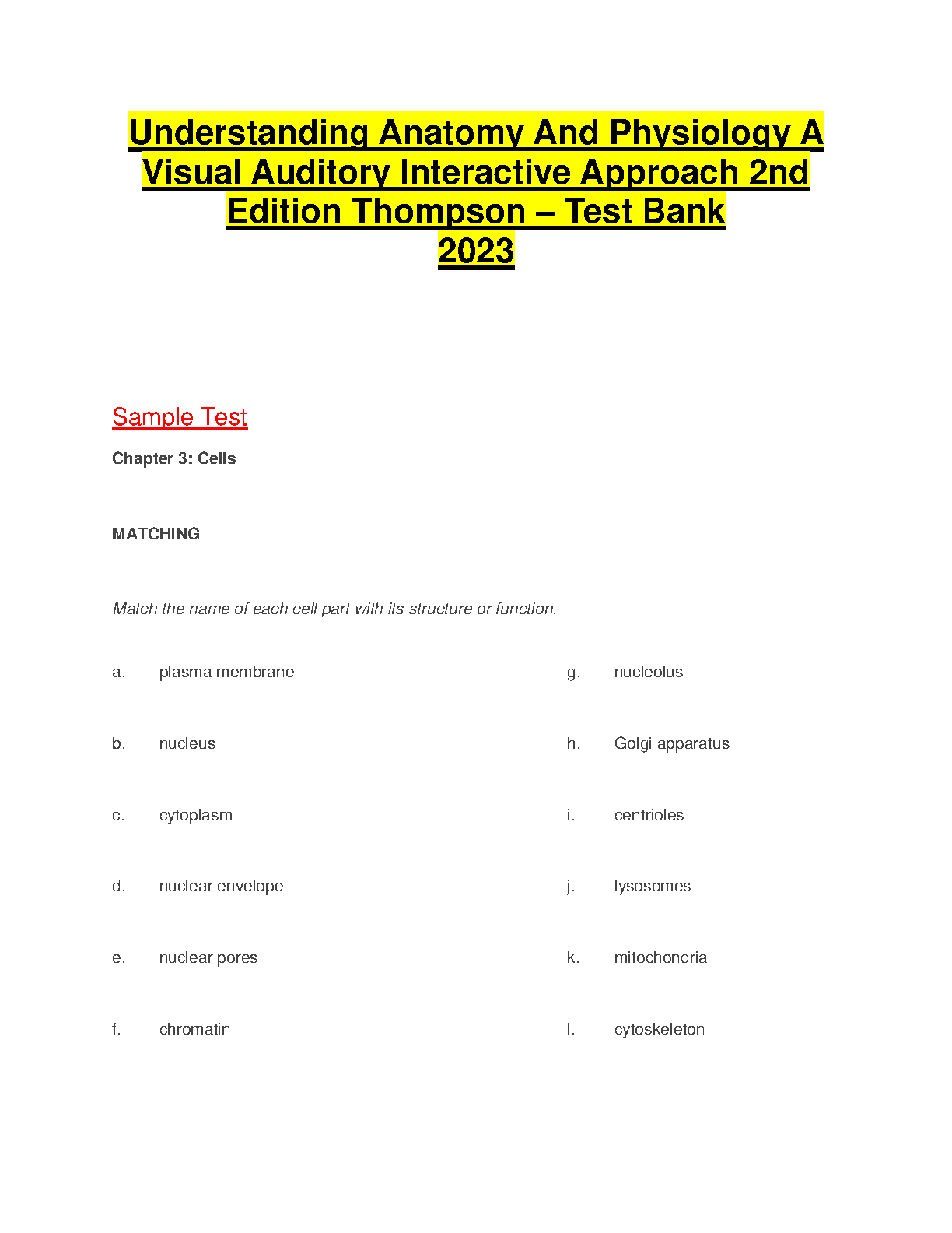 Understanding Anatomy and Physiology: A Visual Auditory Interactive Approach, 2nd Edition - Test Bank by Gerard J. Tortora and Bryan Derrickson