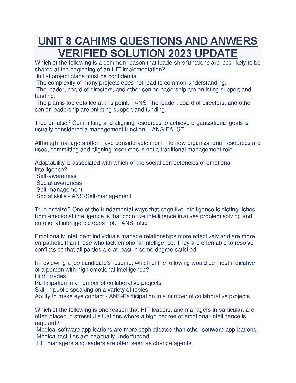CAHIMS Questions and Answers Verified Solution 2023 Update by [Author Names - If available online, otherwise leave blank]