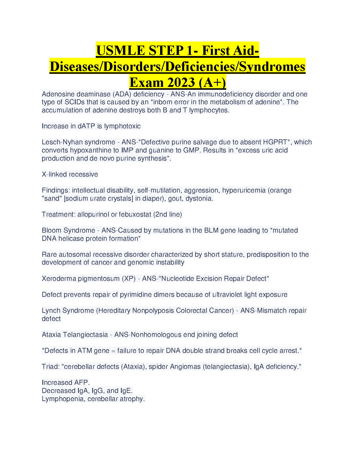 USMLE Step 1 First Aid Diseases Disorders Deficiencies Syndromes Exam 2023 (A+) by [Author Names not found in provided text]
