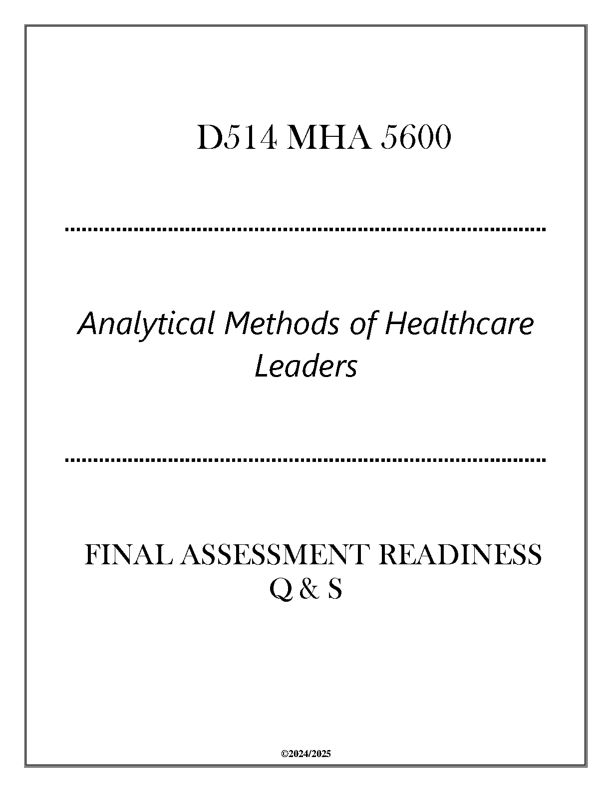 Ace your final exam in Analytical Methods of Healthcare Leaders (D514 MHA 5600) with this comprehensive Q&A resource, designed for the 2024-2025 academic year. Ensure a first-attempt pass and avoid resits!