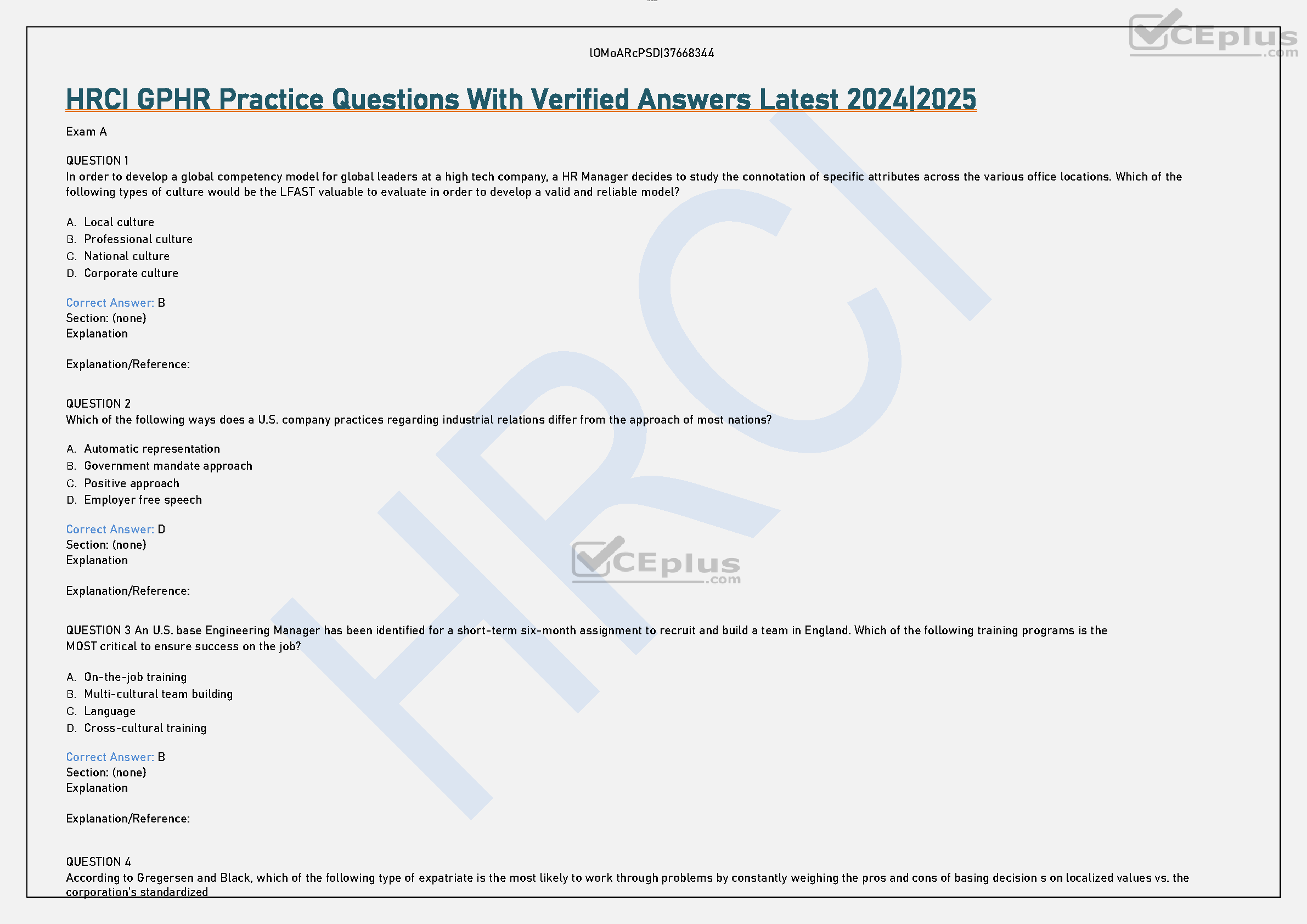 HRCI GPHR Practice Questions With Verified Answers - Latest 2024/2025 Edition by HR Certification Institute