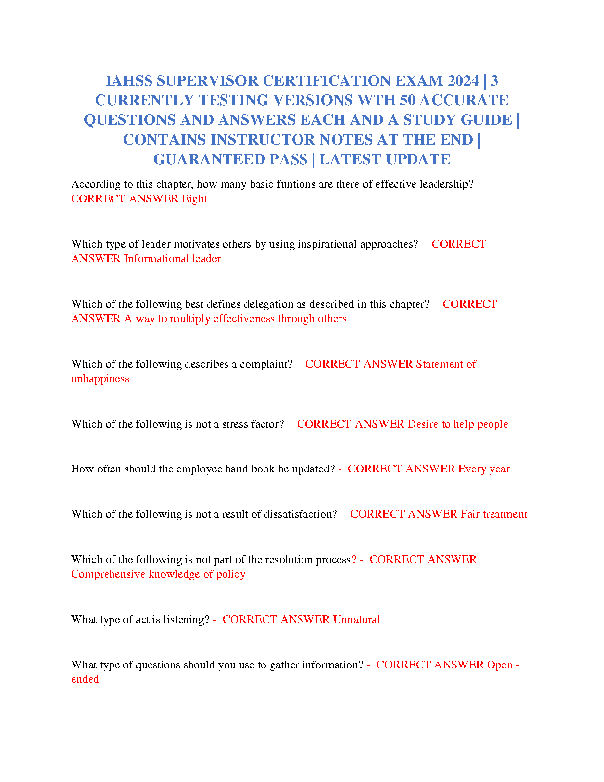 Ace the IAHSS Supervisor Certification Exam with this comprehensive study guide, featuring 50 accurate questions and answers, plus instructor notes. Guaranteed pass! Latest update for 2024/2025.