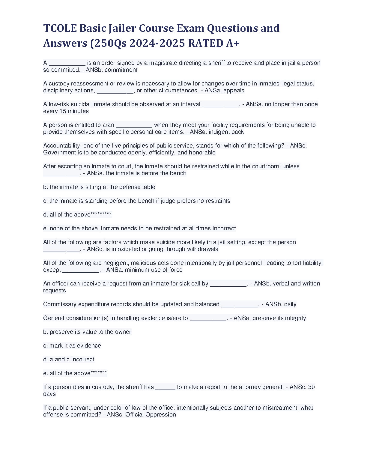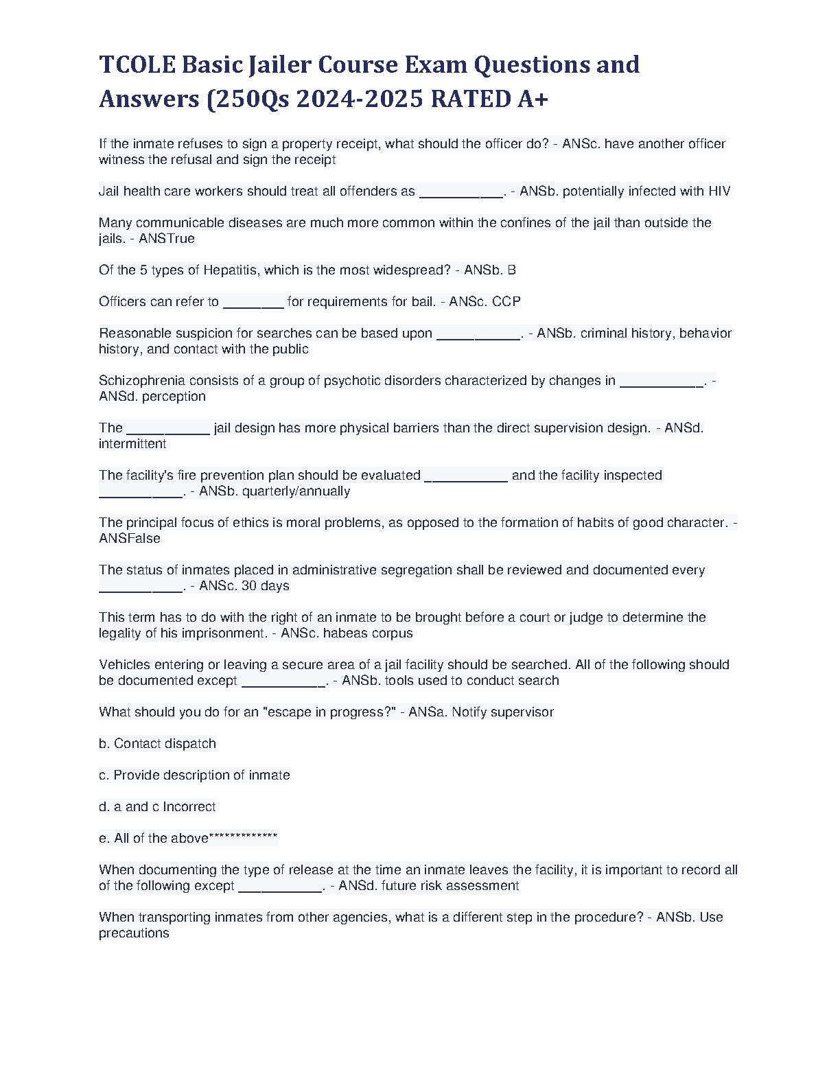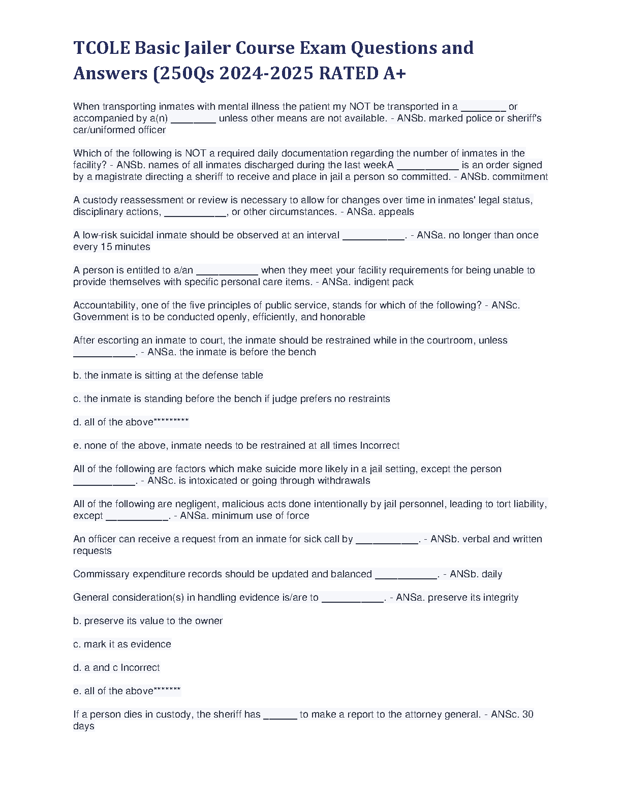 TCOLE Basic Jailer Course Exam Questions and Answers (250Qs) 2024-2025 Edition by Unknown Author