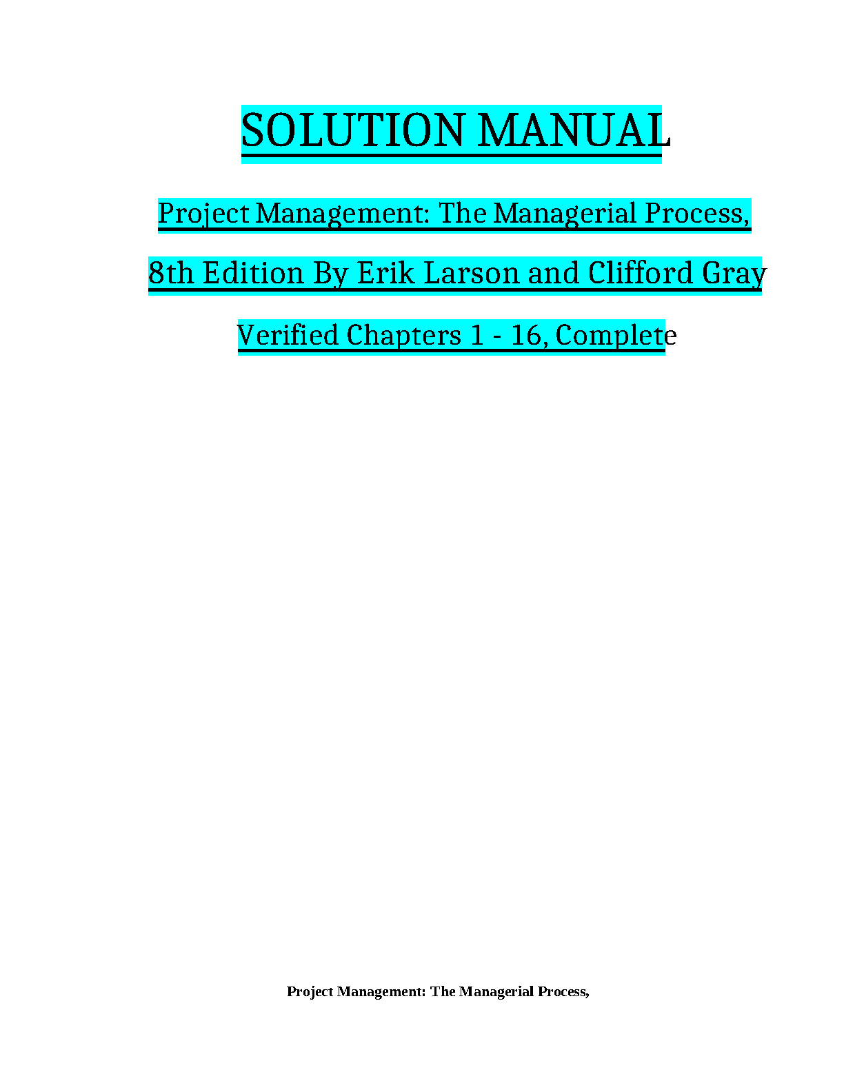 Complete solution manual for Project Management: The Managerial Process, 8th Edition by Erik Larson and Clifford Gray. Verified solutions for chapters 1-16. A valuable resource for students seeking to master the material and achieve exam success on their first attempt.