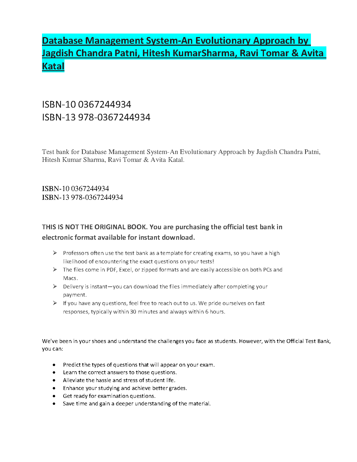 Ace your Database Management System exams with this comprehensive test bank, meticulously crafted by Jagdish Chandra Patni, Hitesh Kumar Sharma, Ravi Tomar, and Avita Katal. This resource offers in-depth coverage of all core concepts, ensuring exam success on your first attempt.
