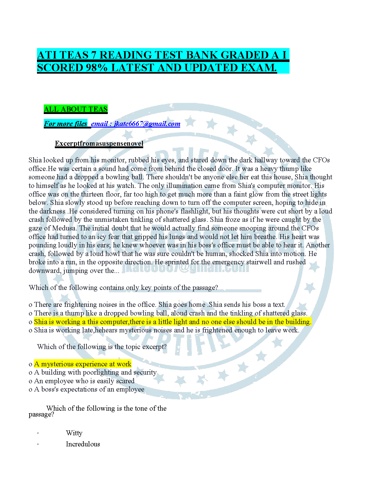 ATI TEAS 7 Reading Test Bank: Latest Edition by Unknown Author - Graded A+ (Scored 98%)
