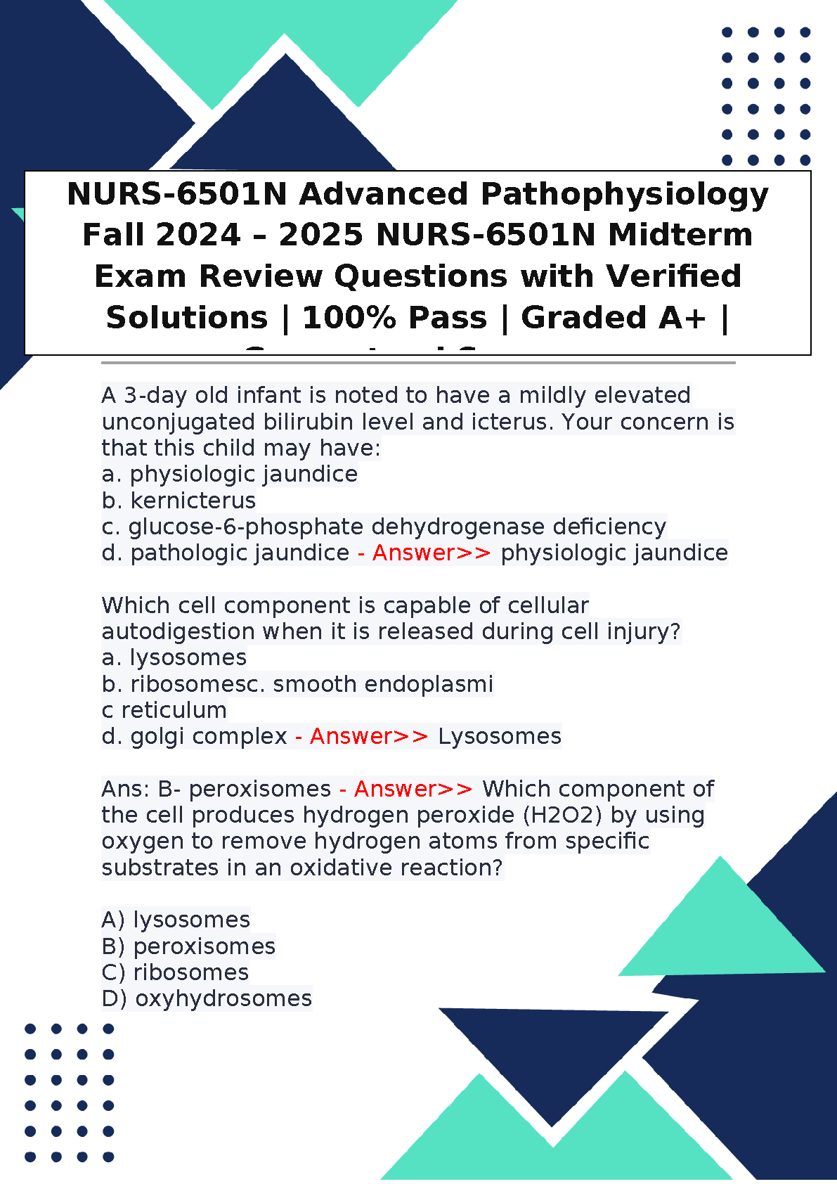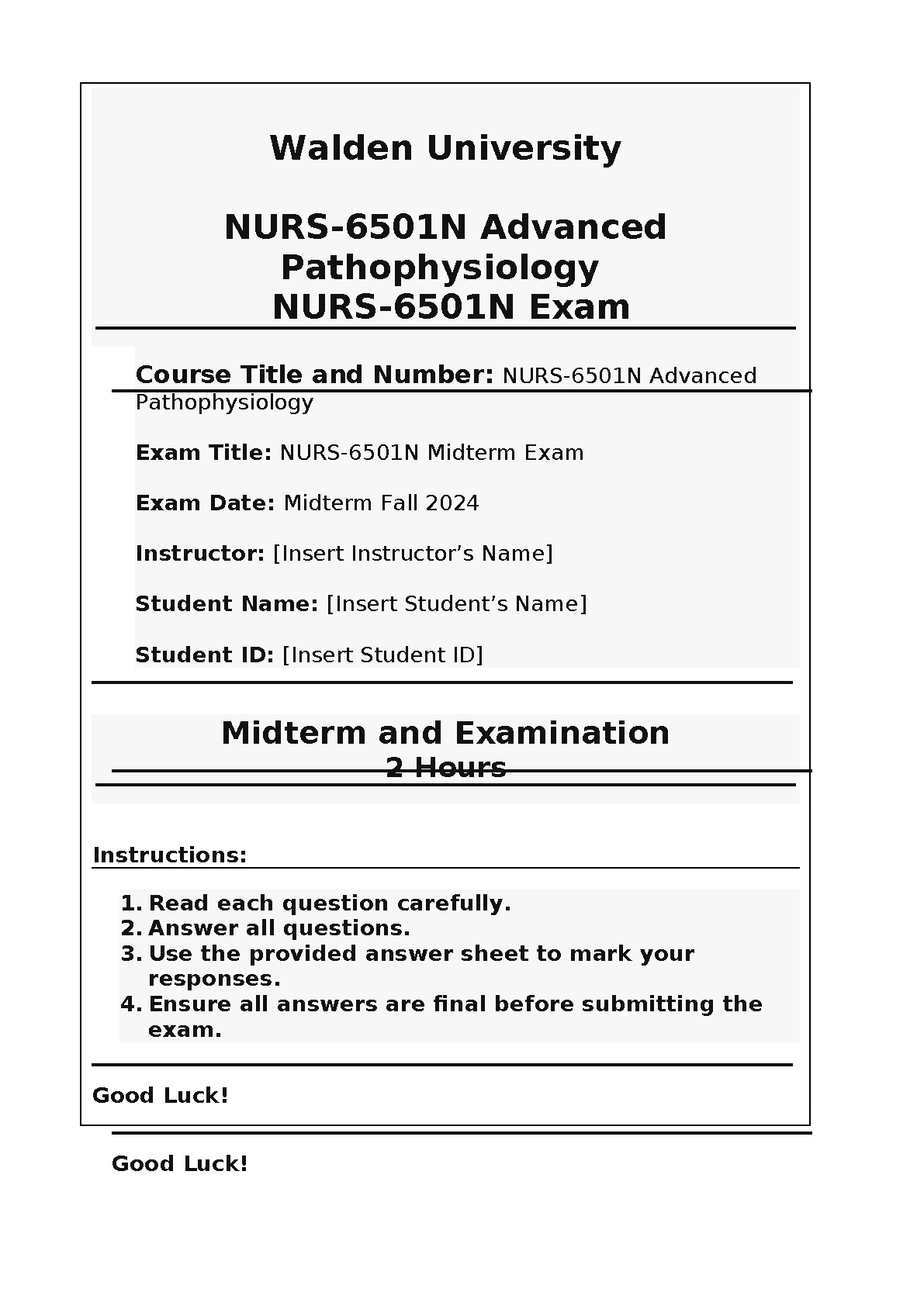 Ace your NURS-6501N Advanced Pathophysiology Midterm Exam with this comprehensive study guide. Designed for Walden University students, this resource covers key concepts and prepares you for exam success, helping you avoid resits.