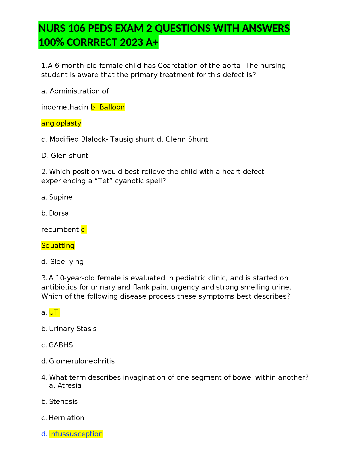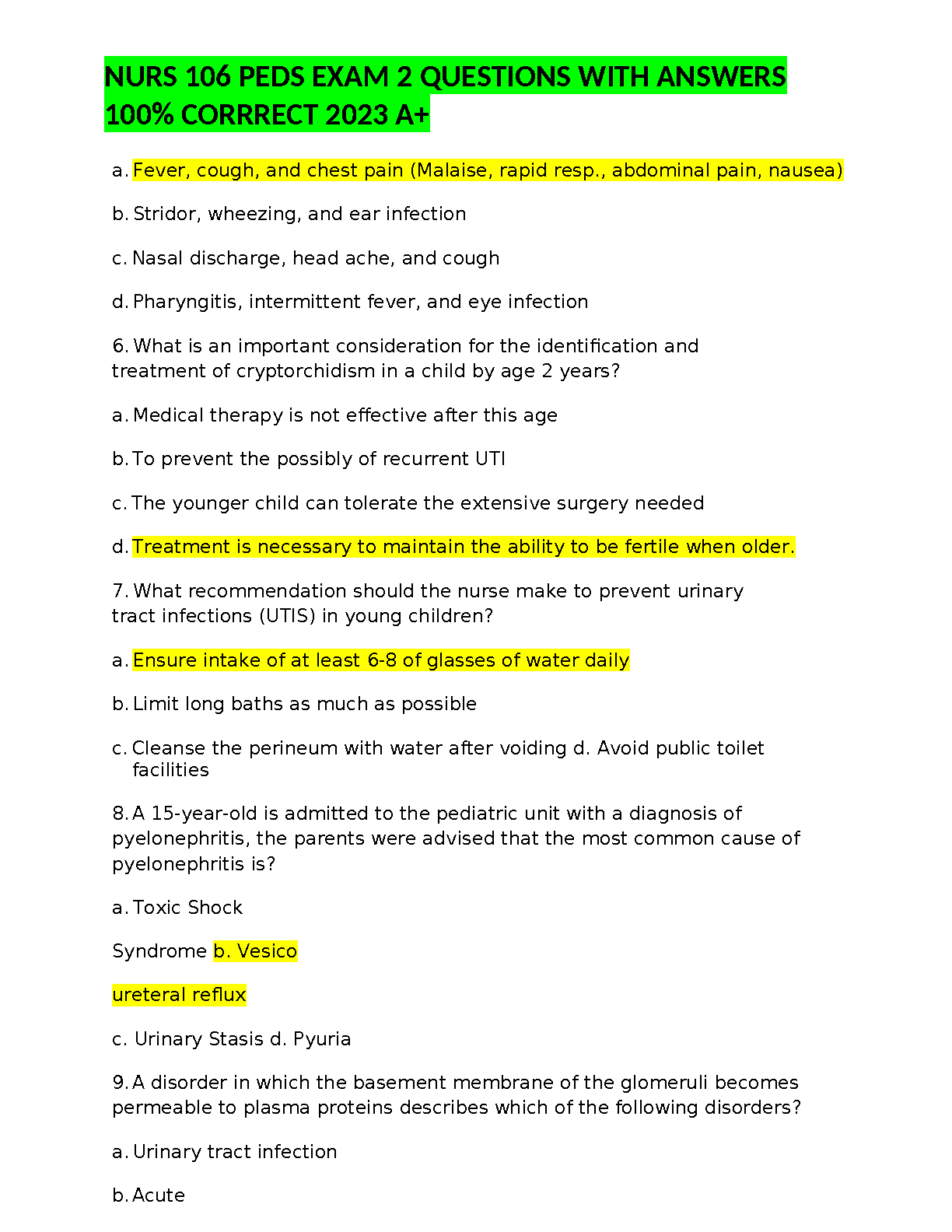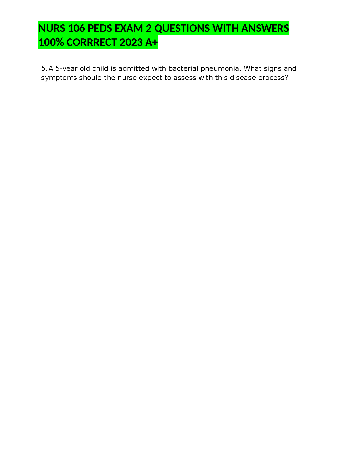 NURS 106 PEDS Exam 2 Questions with Answers 2023 Edition by Unknown Author