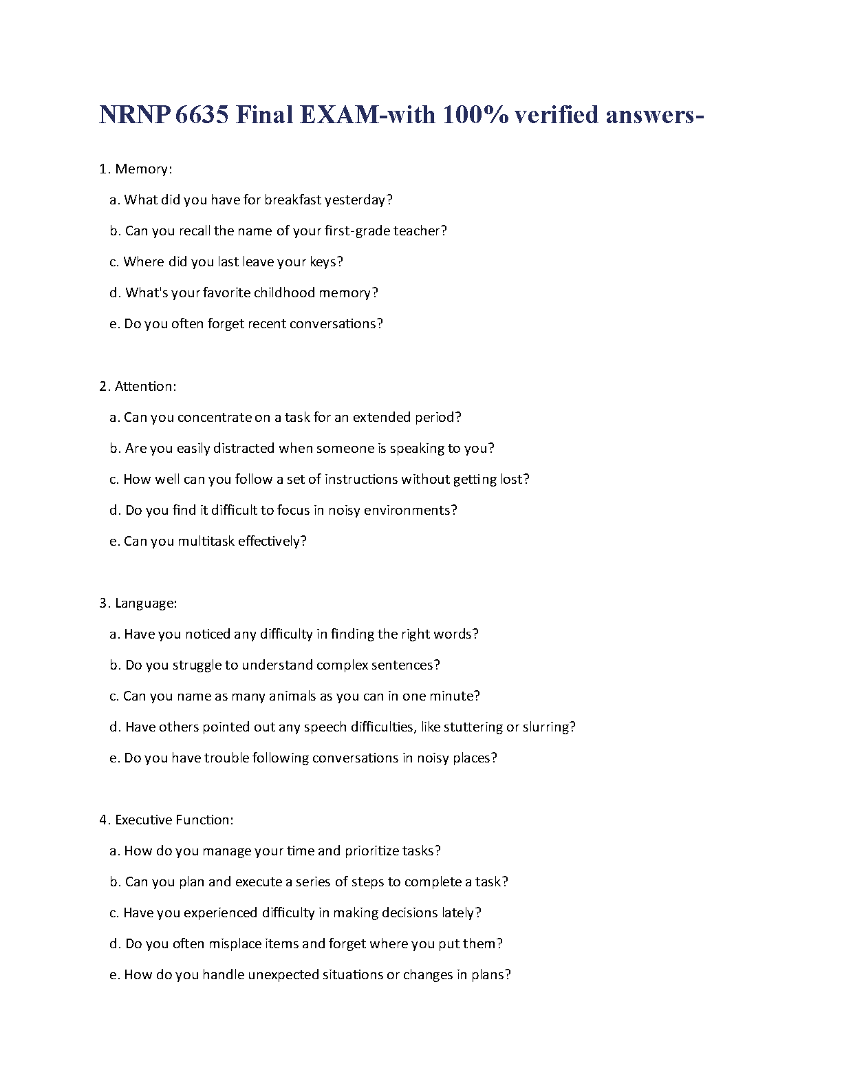 This meticulously crafted study guide for NRNP 6635 provides 100% verified answers to the final exam questions. Designed to help students master the material and pass on their first attempt, this resource covers memory, attention, language, and executive function. Avoid resits and excel in your studies with this essential 2024/2025 edition.