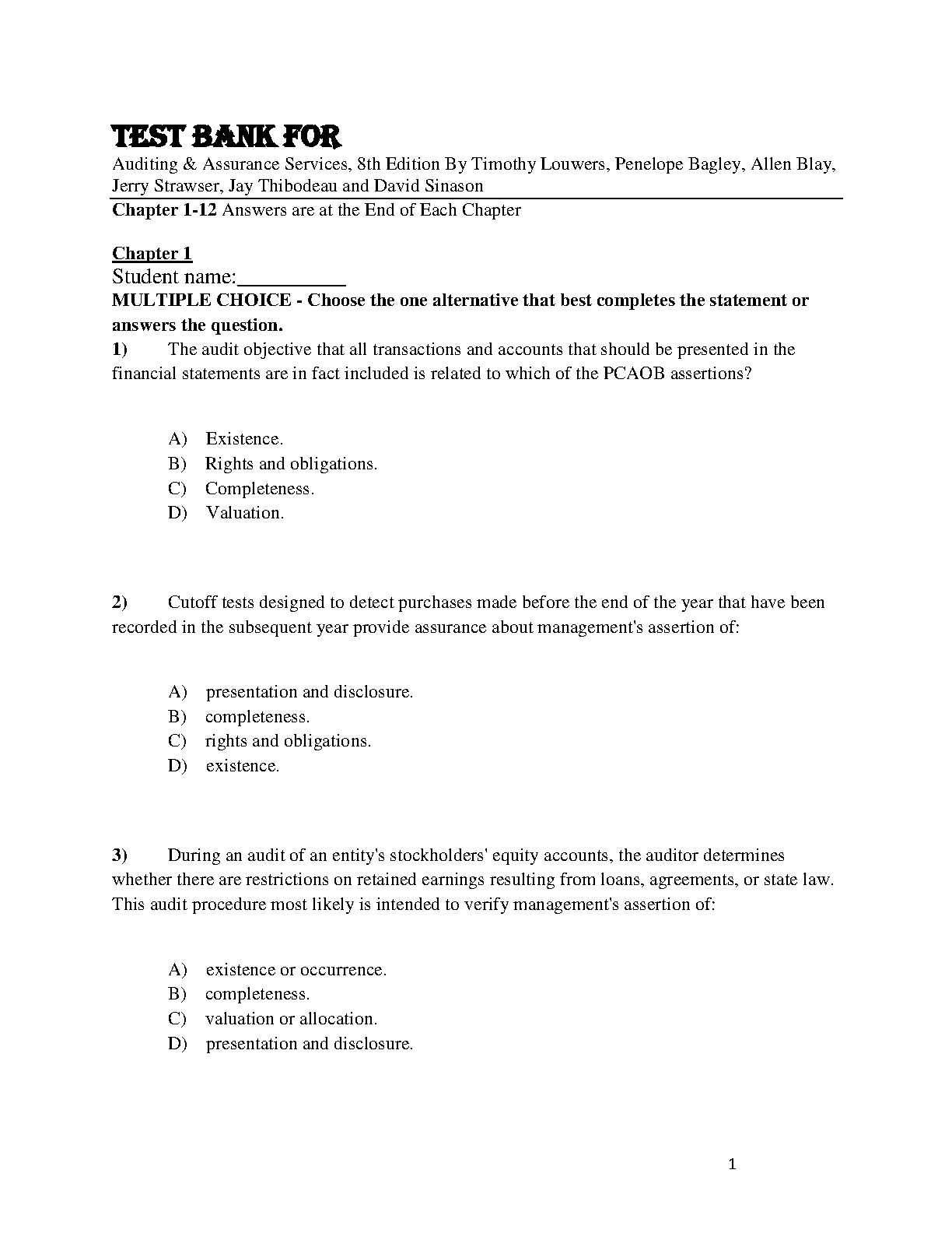 Auditing & Assurance Services, 8th Edition Test Bank by Timothy Louwers, Penelope Bagley, Allen Blay, Jerry Strawser, Jay Thibodeau, and David Sinason