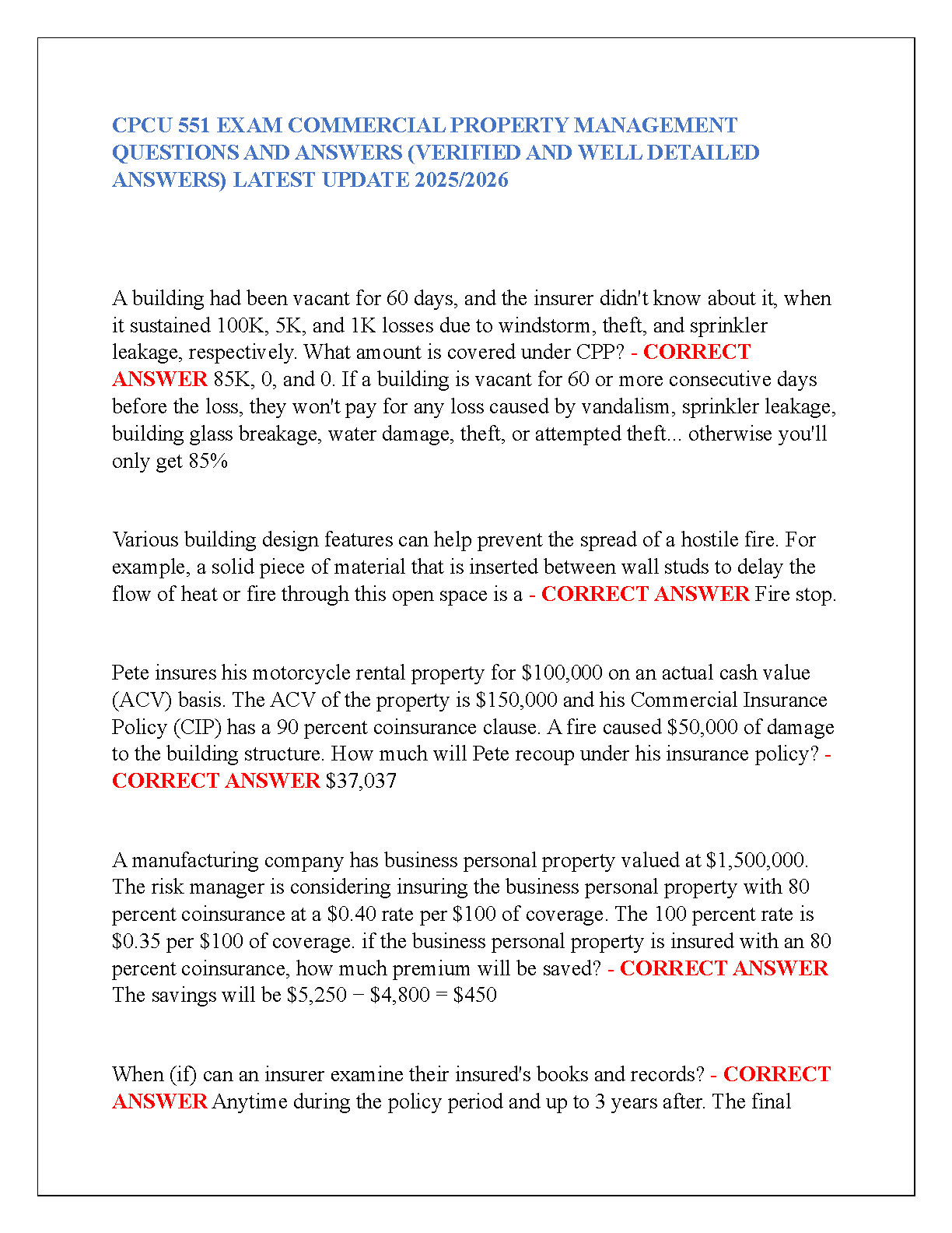 CPCU 551 Exam Commercial Property Management Questions and Answers (Verified and Well-Detailed Answers) 2025/2026 Edition by Unknown Authors