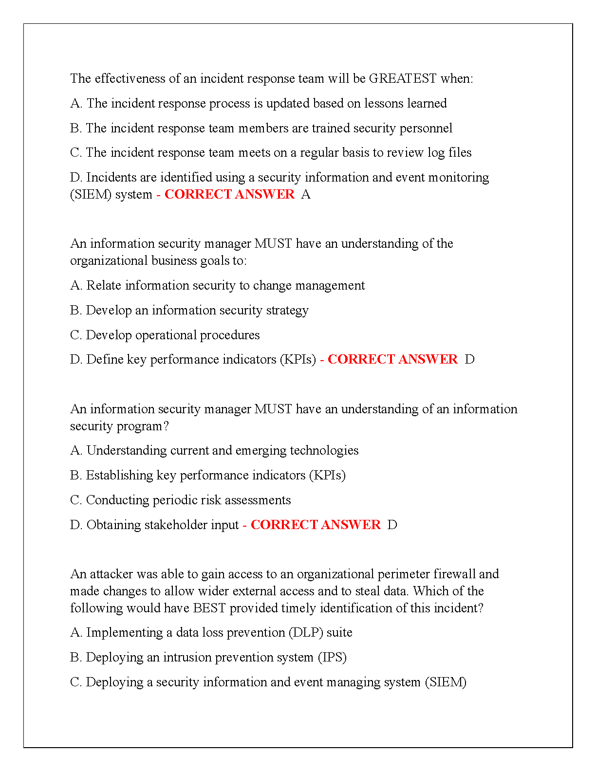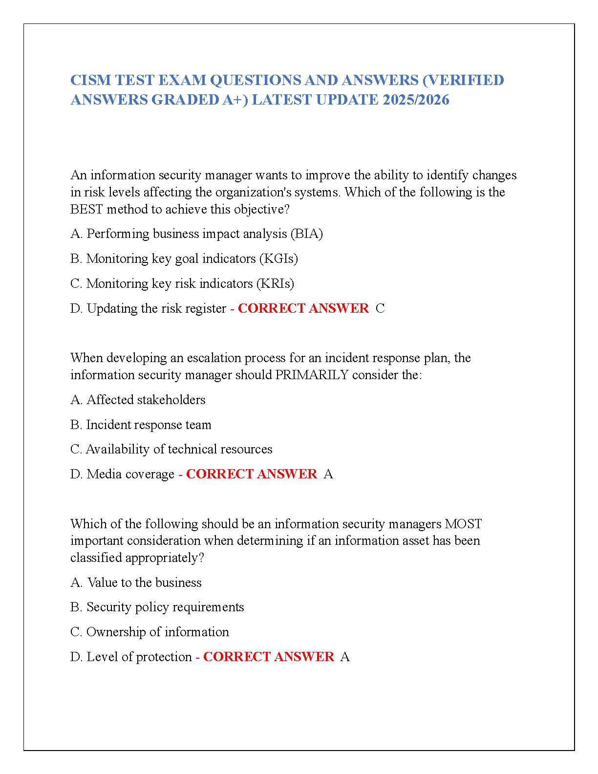 CISM Test Exam Questions and Answers (Verified Answers Graded A+) 2025/2026 Edition by Various Authors