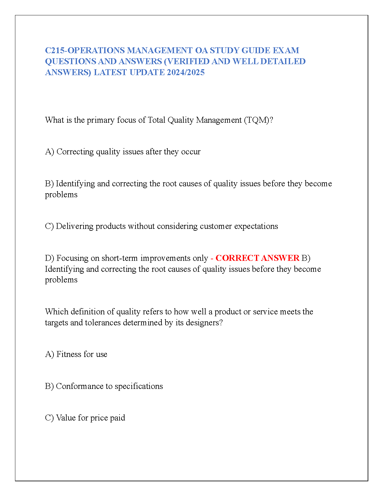 C215 Operations Management OA Study Guide Exam Questions and Answers (Verified and Well-Detailed Answers) 2024/2025 Edition