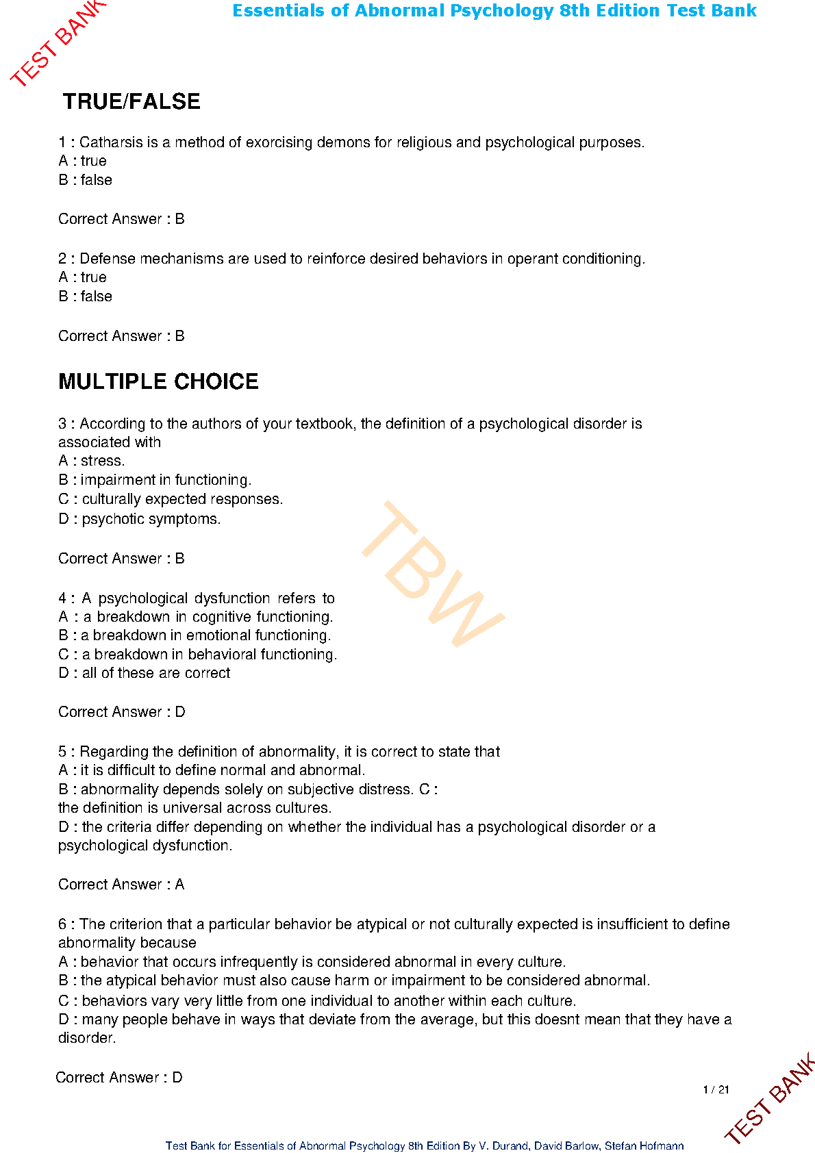 Essentials of Abnormal Psychology 8th Edition Test Bank by V. Mark Durand, David H. Barlow, and Stefan G. Hofmann