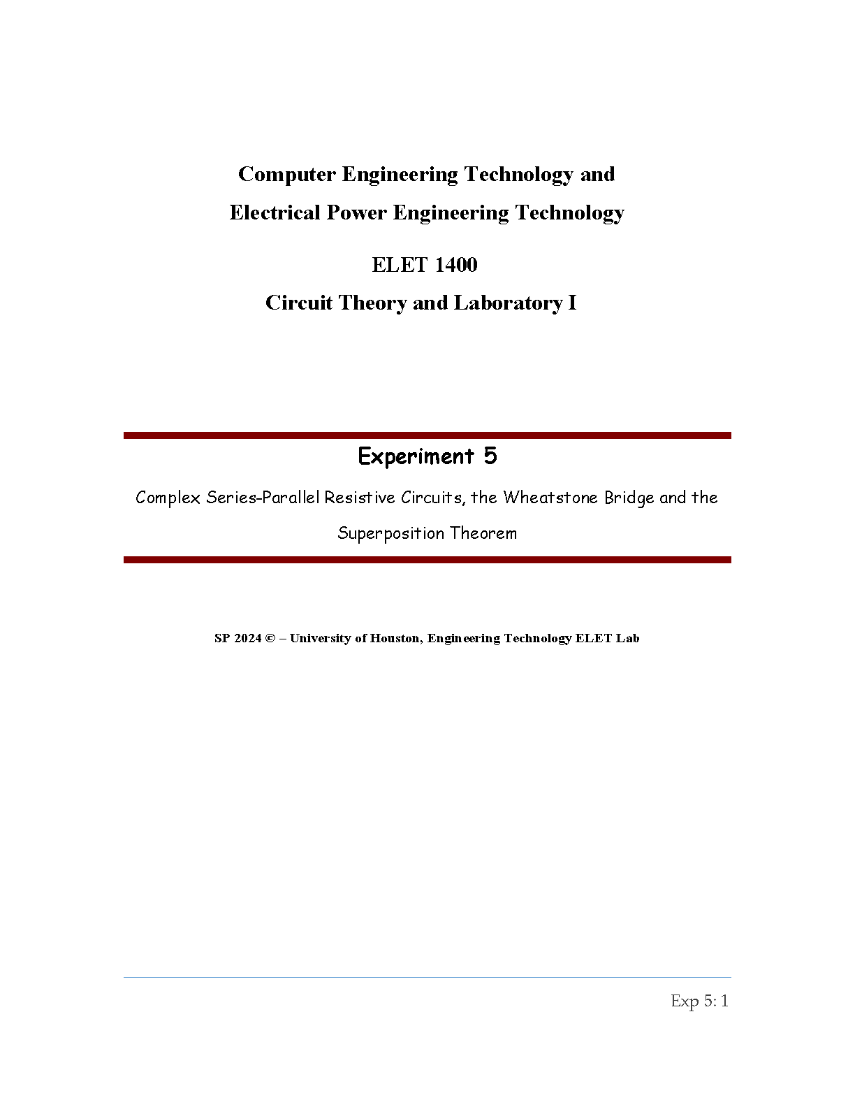 Master circuit analysis with this comprehensive guide to Experiment 5 from University of Houston's ELET 1400 Circuit Theory and Laboratory I course (Spring 2024). This resource covers complex series-parallel resistive circuits, the Wheatstone bridge, and the superposition theorem, ensuring exam success on your first attempt.