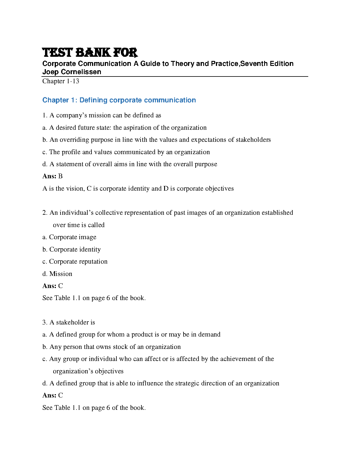 Test Bank for Corporate Communication: A Guide to Theory and Practice, Seventh Edition by Joep Cornelissen