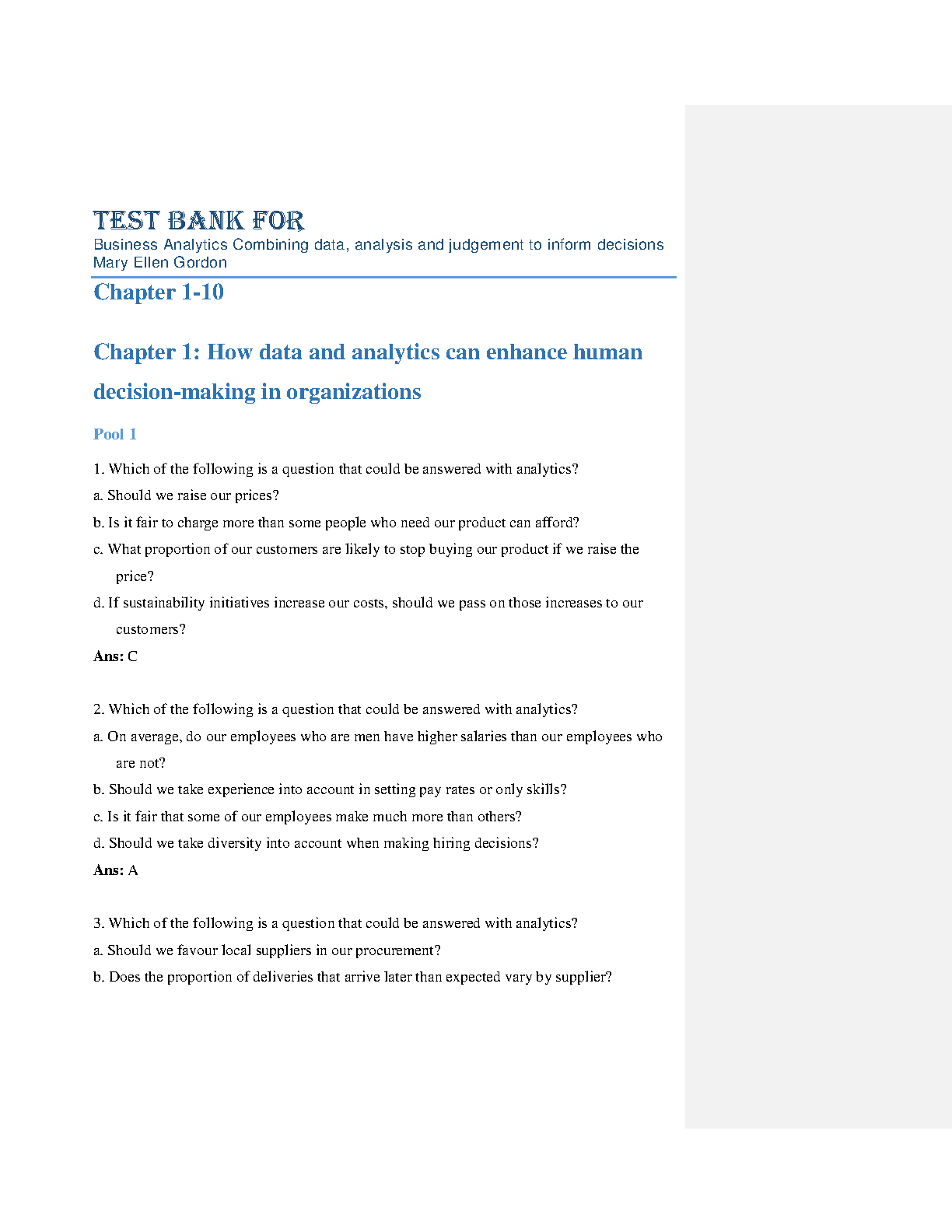 Test Bank for Business Analytics Combining Data, Analysis, and Judgement to Inform Decisions, 1st Edition by Mary Ellen Gordon