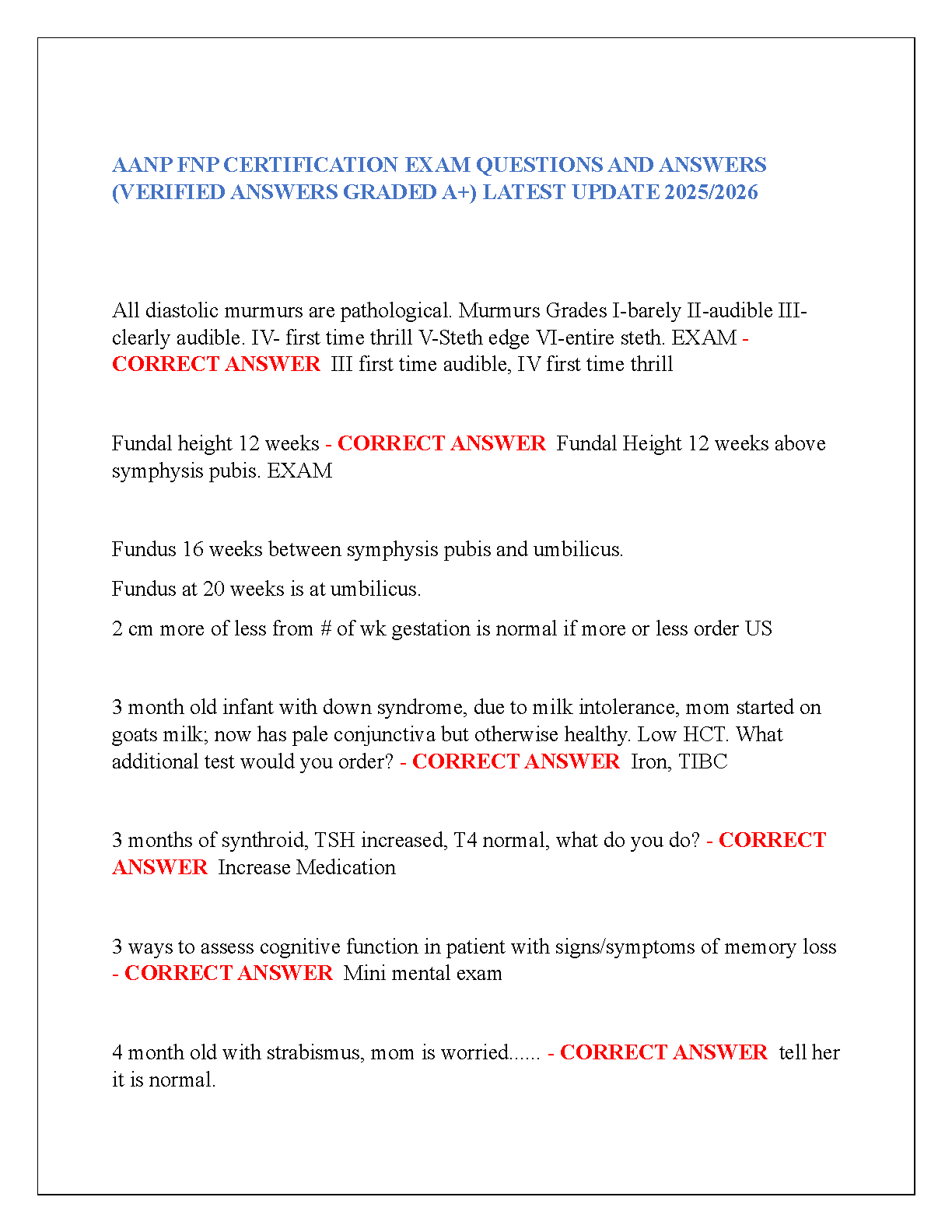 Ace your AANP FNP Certification exam with this latest 2025/2026 edition question bank. Verified answers graded A+ will ensure you pass on your first attempt and avoid resits.