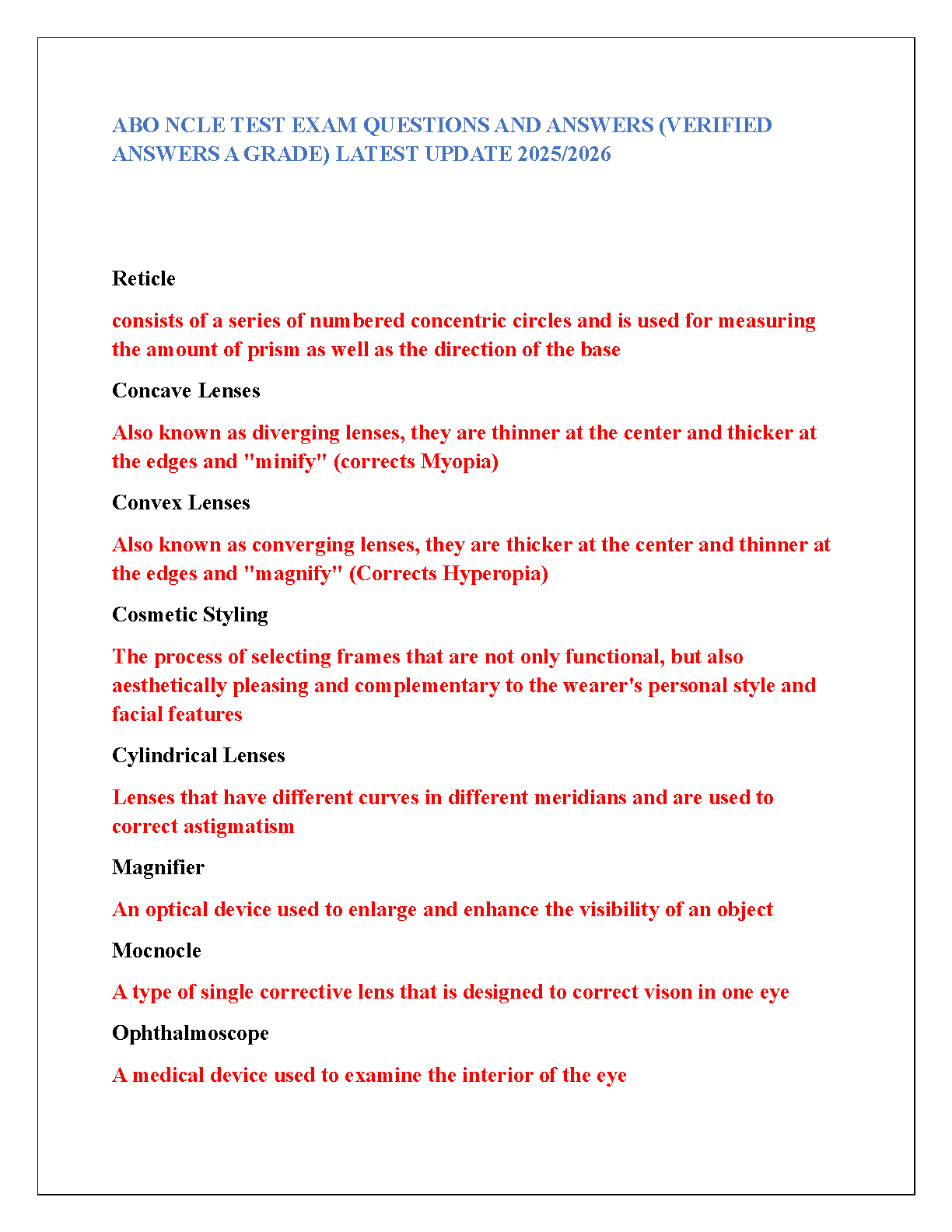 ABO NCLE Test Exam Questions and Answers (Verified Answers A Grade) Latest Update 2025/2026