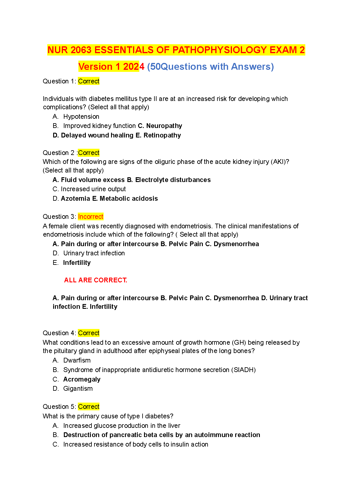 Ace your NUR 2063 Essentials of Pathophysiology Exam 2 with this comprehensive question bank featuring 50 questions and answers. Perfect for students aiming to pass on their first try and avoid resits. This 2024/2025 edition covers key concepts and prepares you for exam success.