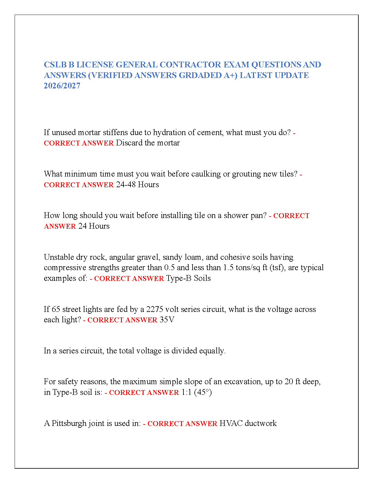 Ace your CSLB B License General Contractor Exam with this comprehensive question bank featuring verified answers graded A+. This latest update (2026/2027) helps you avoid resits and pass on your first try.