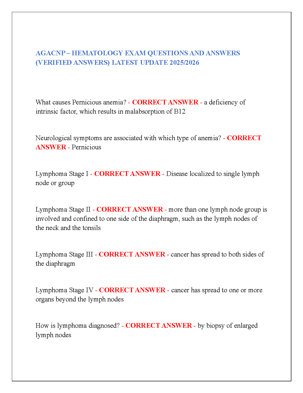 AGACNP Hematology Exam Questions and Answers 2025/2026 Edition: Verified Answers for First-Time Pass