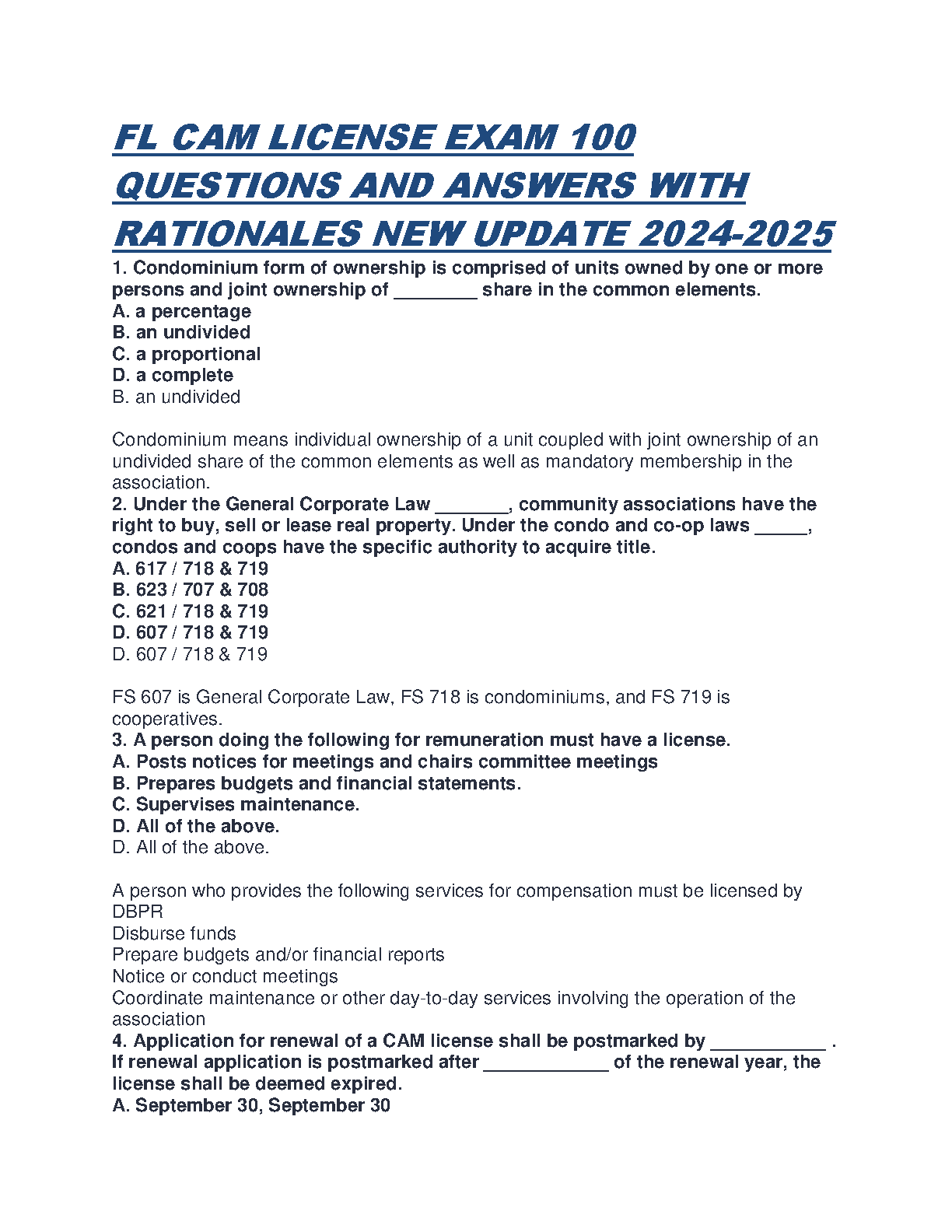 Ace your FL CAM License Exam with this comprehensive 2024-2025 edition. This resource includes 100 questions and answers with detailed rationales to help you understand the material and pass on your first attempt. Avoid resits and boost your exam confidence today!