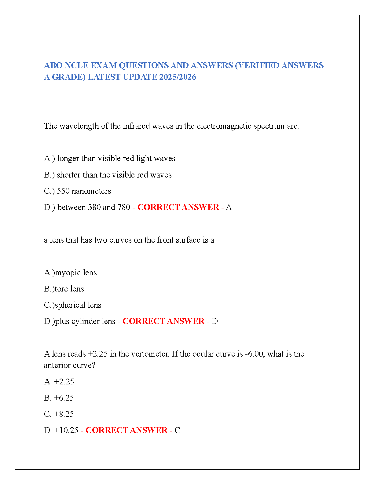 ABO NCLE Exam Questions and Answers (Verified Answers A Grade) 2025/2026 Edition by [Author Names Unavailable]