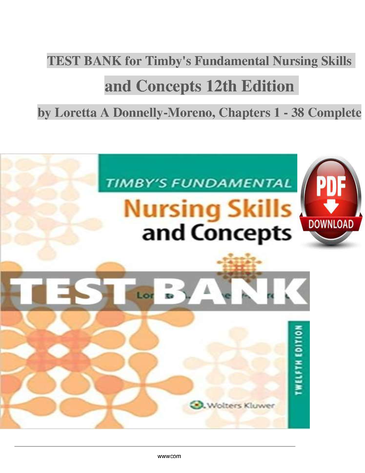 Ace your nursing exams with this complete test bank for Timby's Fundamental Nursing Skills and Concepts, 12th Edition by Loretta A. Donnelly-Moreno. Covering chapters 1-38, this resource helps you master the material and pass on your first attempt. Download now and avoid resits!