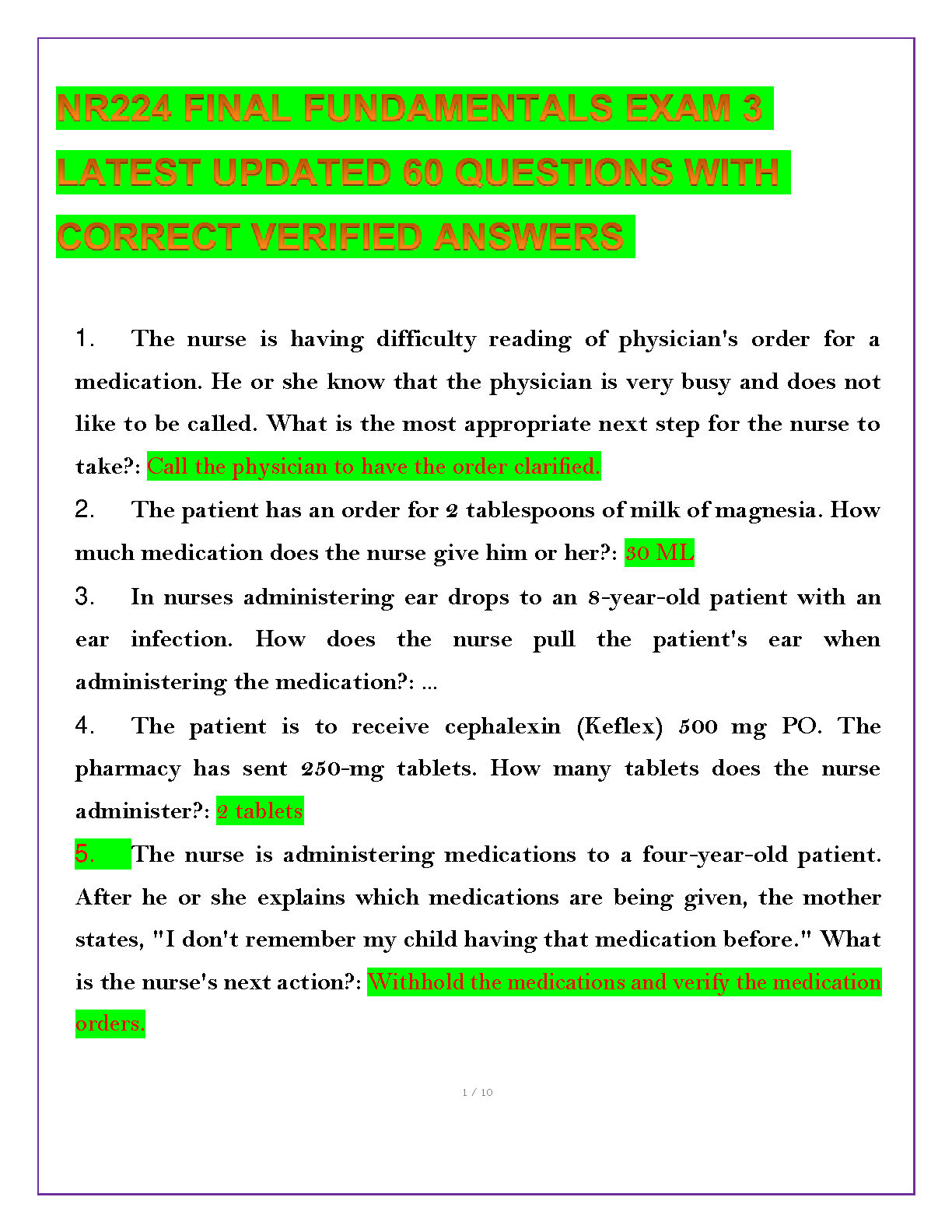 NR224 Fundamentals Exam 3: Latest Updated 60 Questions with Correct Verified Answers