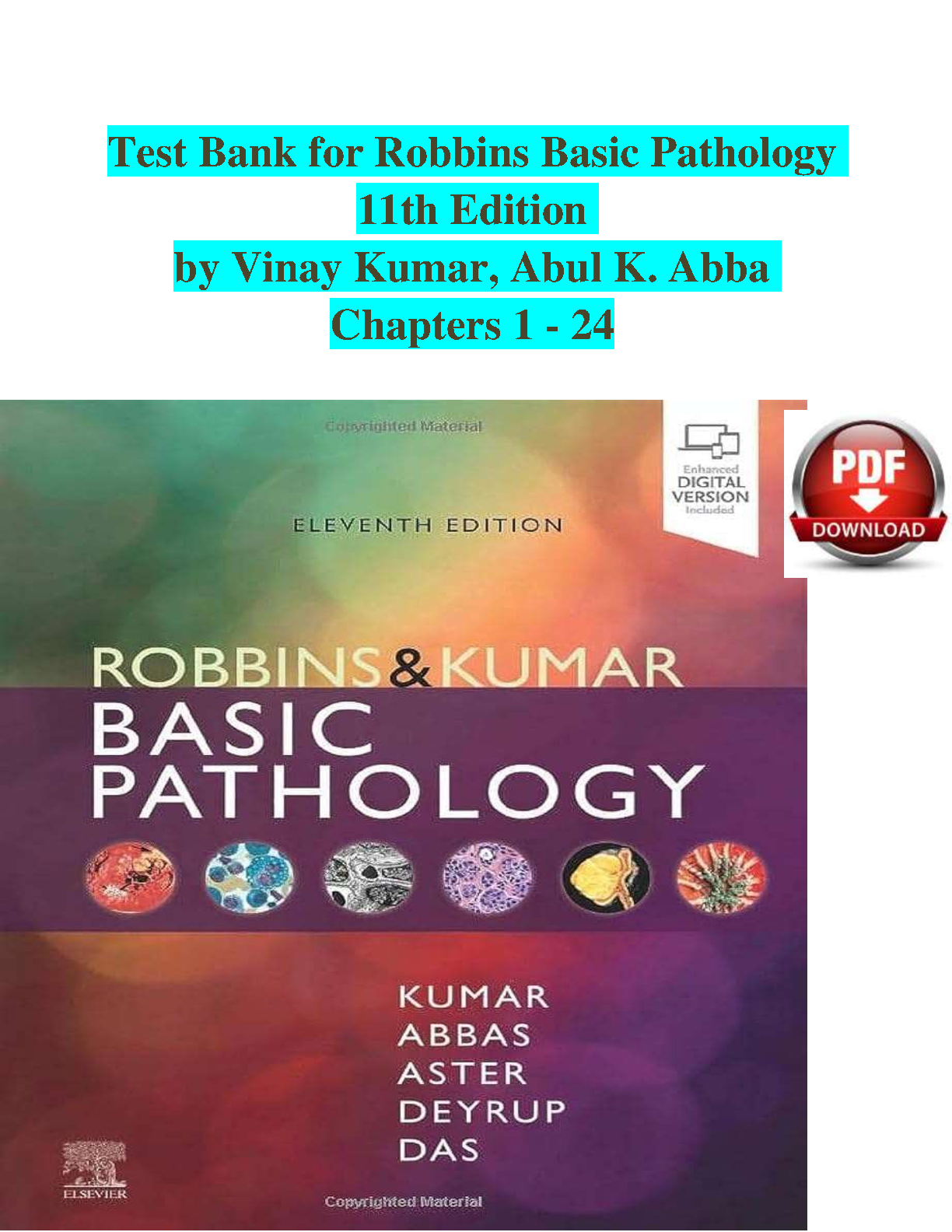 Access the complete test bank for Robbins and Kumar's Basic Pathology, 11th Edition. This resource, authored by Vinay Kumar, Abul K. Abbas, Jon C. Aster, Ramzi S. Cotran, and Nelson Fausto, covers chapters 1-24 and is designed to help students master the subject matter and ace their exams. Prepare effectively for success and avoid resits.