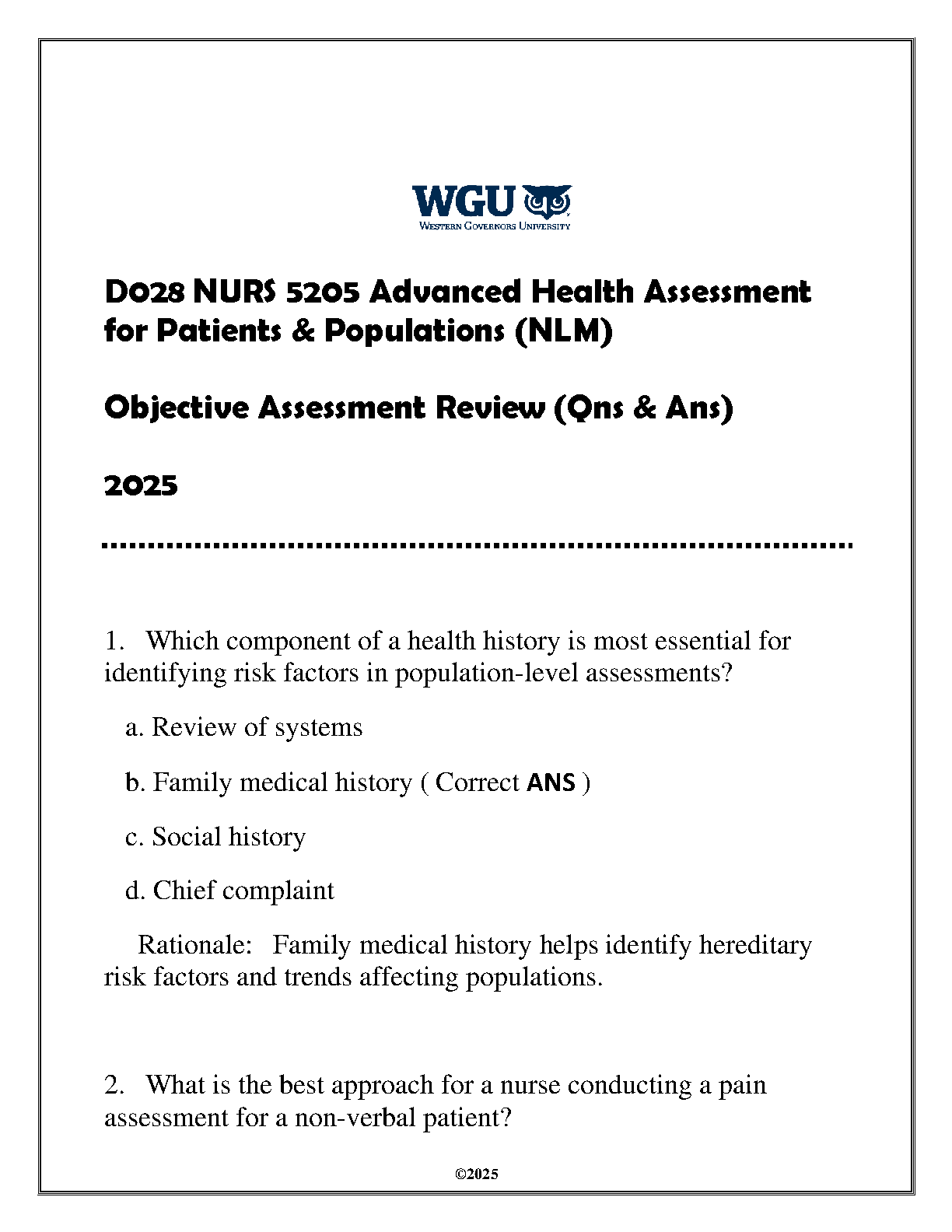 WGU NURS 5205 Advanced Health Assessment for Patients & Populations (NLM) 2025 Edition: Objective Assessment Review Questions and Answers