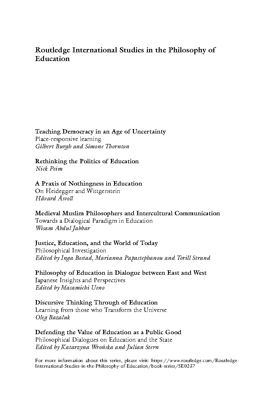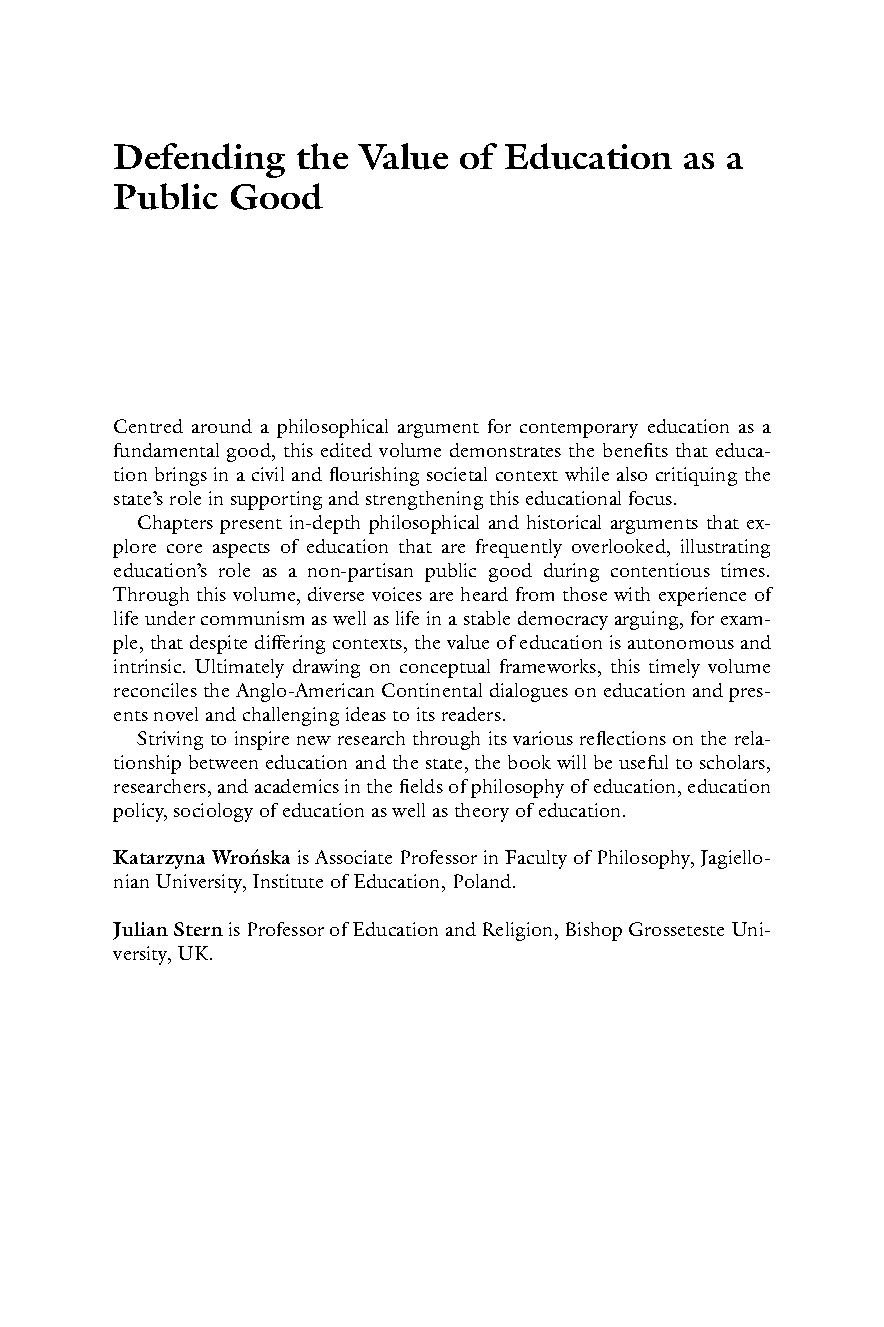 Explore the philosophical arguments for valuing education as a public good in this insightful book edited by Katarzyna Wrońska and Julian Stern. This essential text examines the complex relationship between education and the state through dialogues that cover various key issues. Ideal for students and scholars in education, philosophy, and political science.