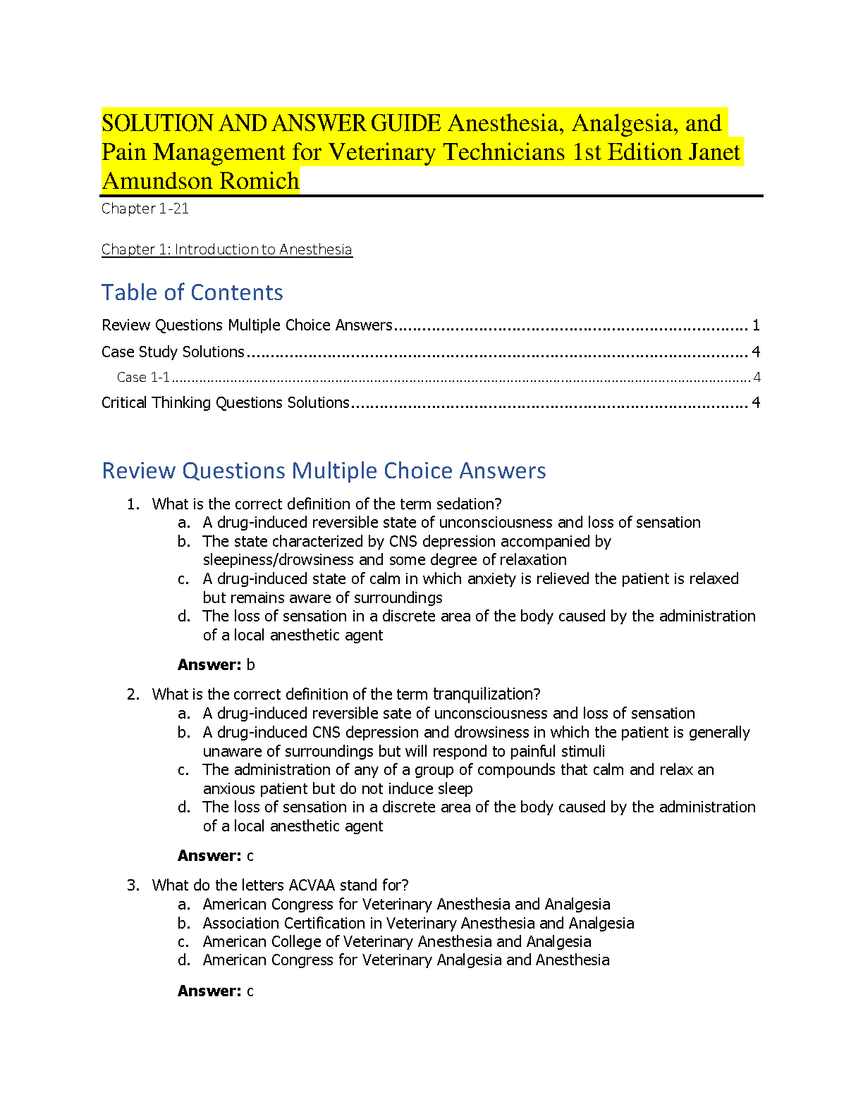 Solution and Answer Guide: Anesthesia, Analgesia, and Pain Management for Veterinary Technicians, 1st Edition - Janet Amundson Romich and Mary Romich