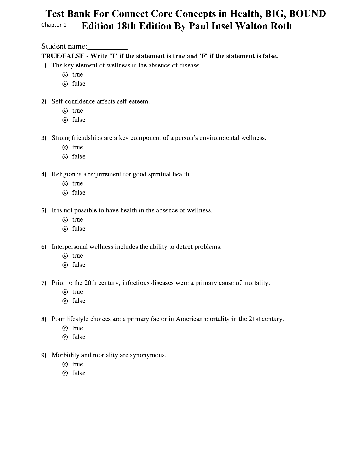 Connect Core Concepts in Health, BIG, BOUND Edition 18th Edition Test Bank by Paul Insel and Walton Roth