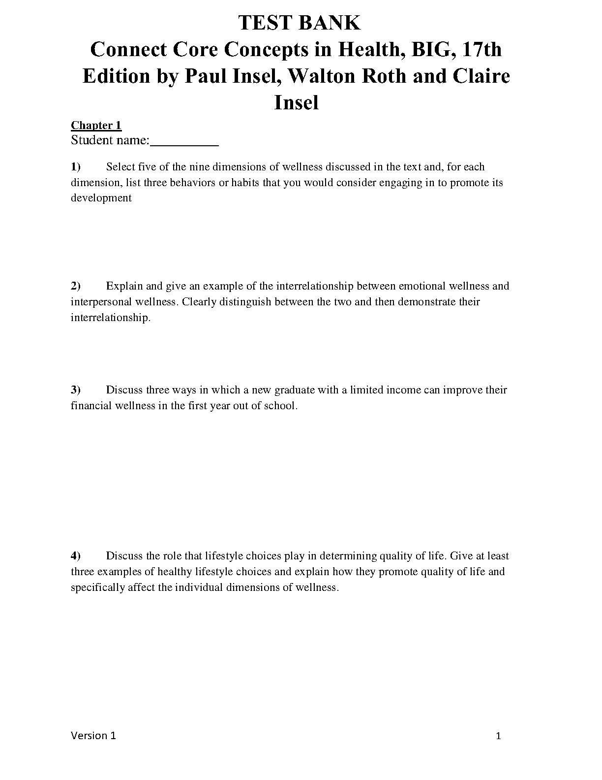 Connect Core Concepts in Health: Test Bank - 17th Edition by Claire E. Insel, Walton T. Roth, and Paul M. Insel