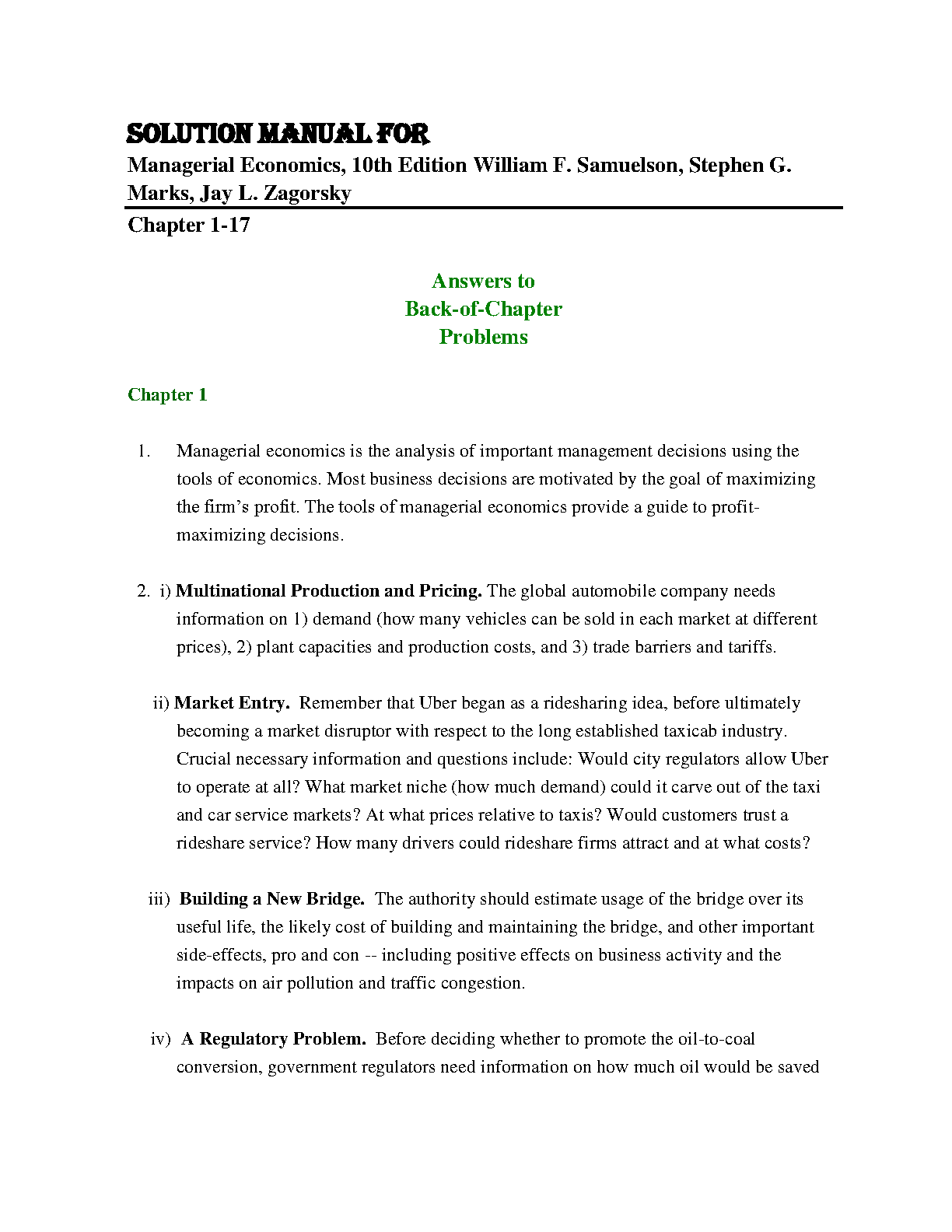 Solution Manual for Managerial Economics, 10th Edition by William F. Samuelson, Stephen G. Marks, and Jay L. Zagorsky