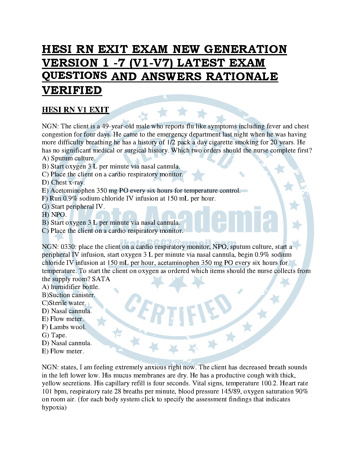 Verified HESI RN Exit Exam New Generation Version 1-7 (V1-V7) questions and answers rationale, designed to help students pass their exams on the first attempt. This resource covers a wide range of topics and provides detailed explanations for each answer, making it an invaluable tool for exam preparation.