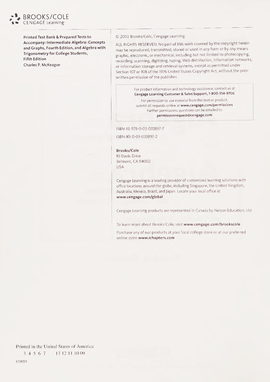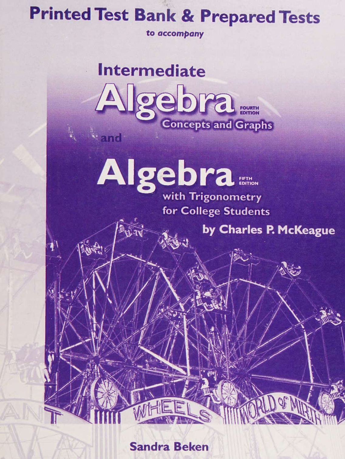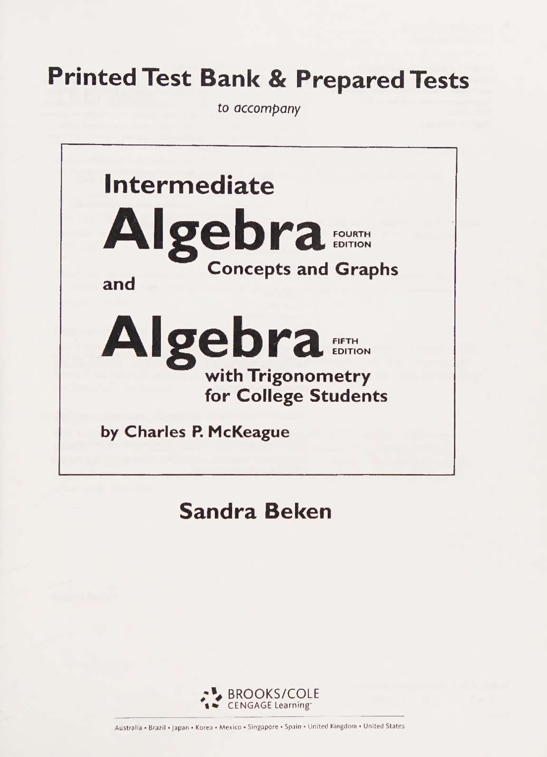 This resource is a complete test bank and prepared tests to accompany the Intermediate Algebra Concepts and Graphs, Fourth Edition and Algebra with Trigonometry for College Students, Fifth Edition textbooks by Charles P. McKeague and Sandra Beken. It's designed to help students master the concepts and succeed in their algebra courses. Prepare for exams confidently and achieve your academic goals.