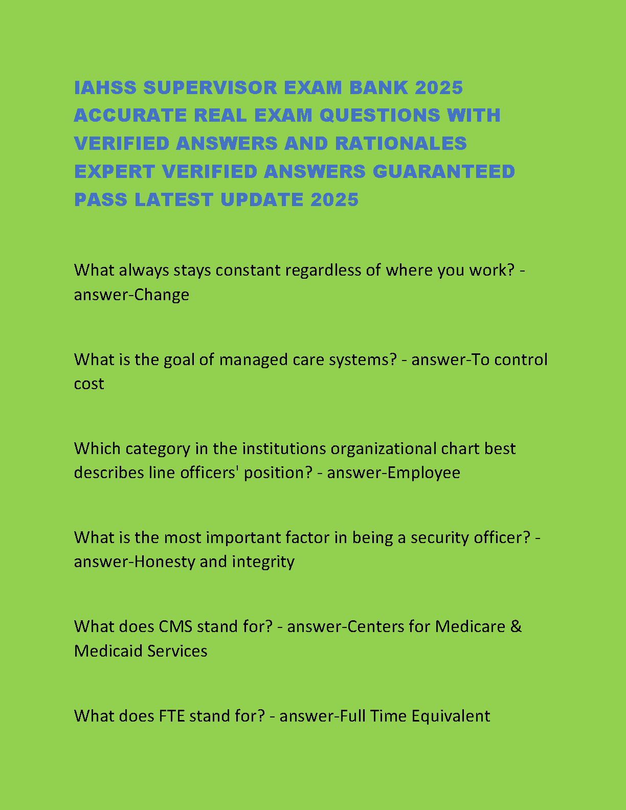 IAHSS Supervisor Exam Bank 2025: Accurate Real Exam Questions with Verified Answers and Rationales by Expert Verified Answers Guaranteed