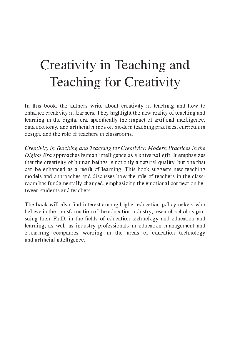 Unlock your teaching potential with "Creativity in Teaching and Teaching for Creativity," a comprehensive guide designed to help educators cultivate creative thinking in engineering students. This first edition explores modern practices in the digital age, equipping you with innovative strategies to foster creativity and boost student success. Master the art of inspiring your students to think outside the box and excel in their studies.