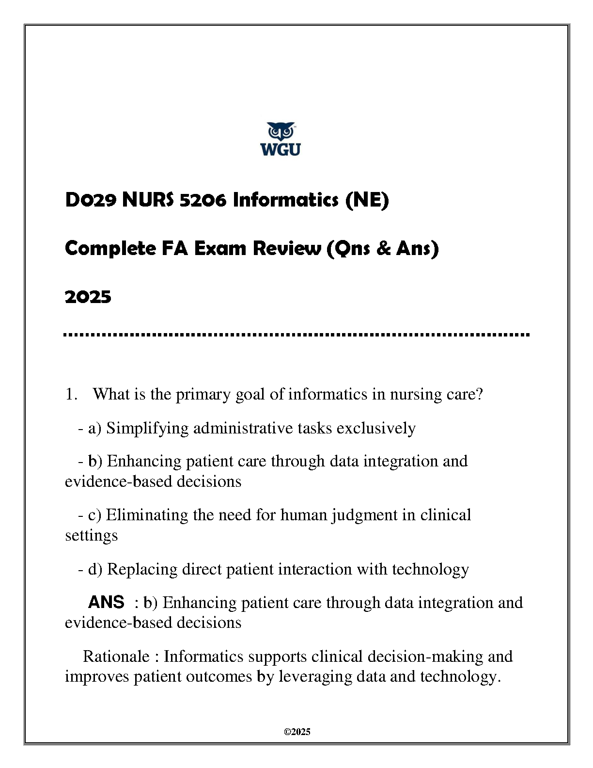 Ace your Western Governors University D029 NURS 5206 Informatics (NE) Final Assessment with this comprehensive exam review. This resource contains questions and answers covering key concepts, ensuring exam success on your first attempt. Prepare effectively and avoid resits. Ideal for the 2024-2025 academic year.