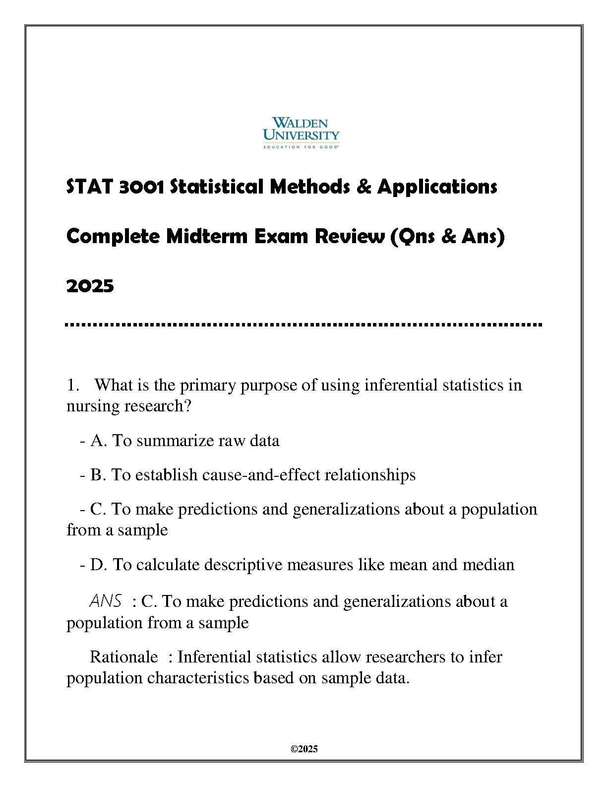 STAT 3001 Statistical Methods & Applications: Complete Midterm Exam Review (Questions & Answers) 2025 Edition by Walden University